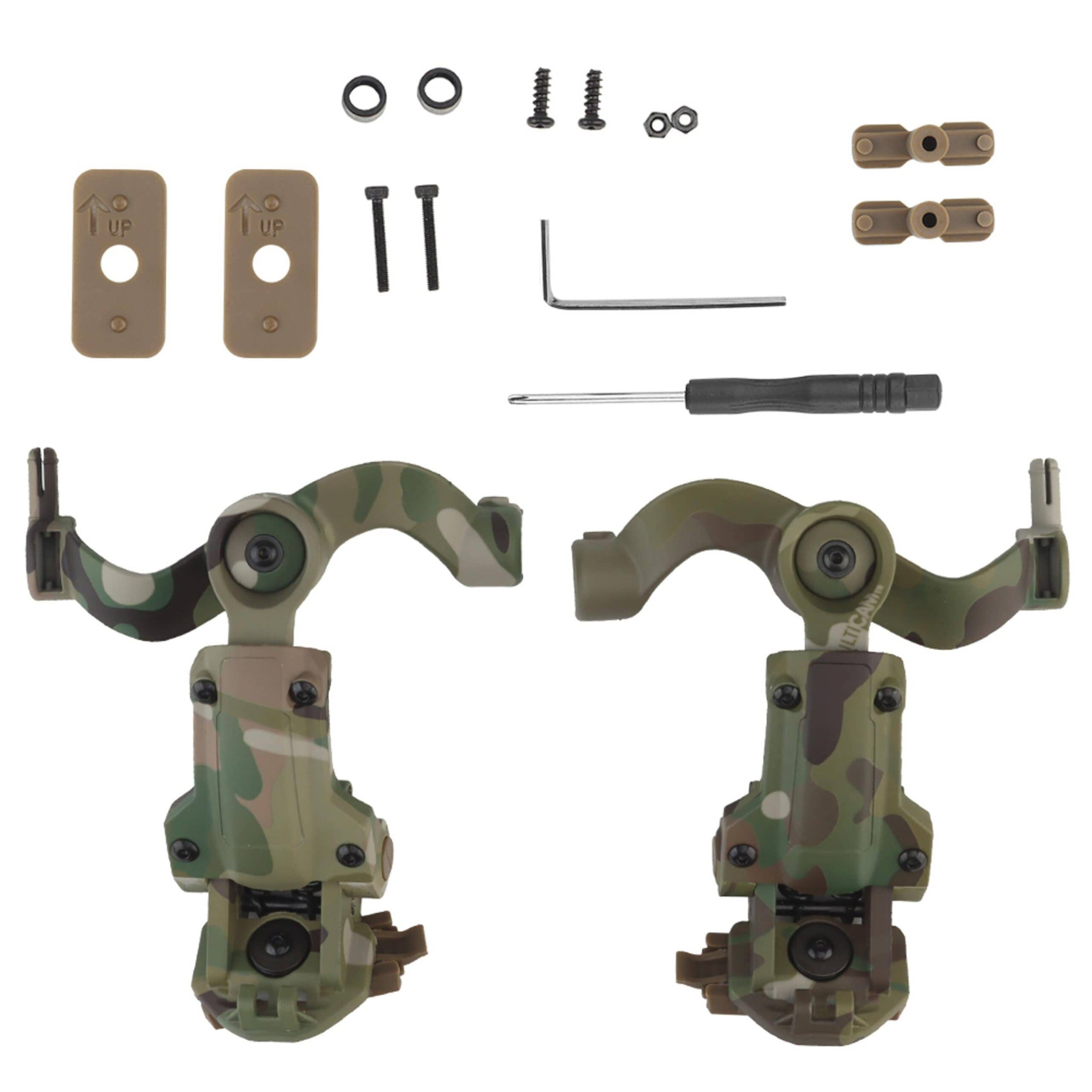 Кріплення адаптер на каску шолом для навушників Peltor/Earmor/Howard (Чебурашка) Мультикам дає можливість встановлювати активні навушники 3M Peltor RangeGuard, Howard Leight Impact Sport, а також моделі Earmor M31/M32/M31H/M32H і Walkers Razor (не сумісні з Quad і Firemax) прямо на шоломи типів FAST, TOR-D, ACH MICH та інші, обладнані рейками ARC або Wendy LOK.
