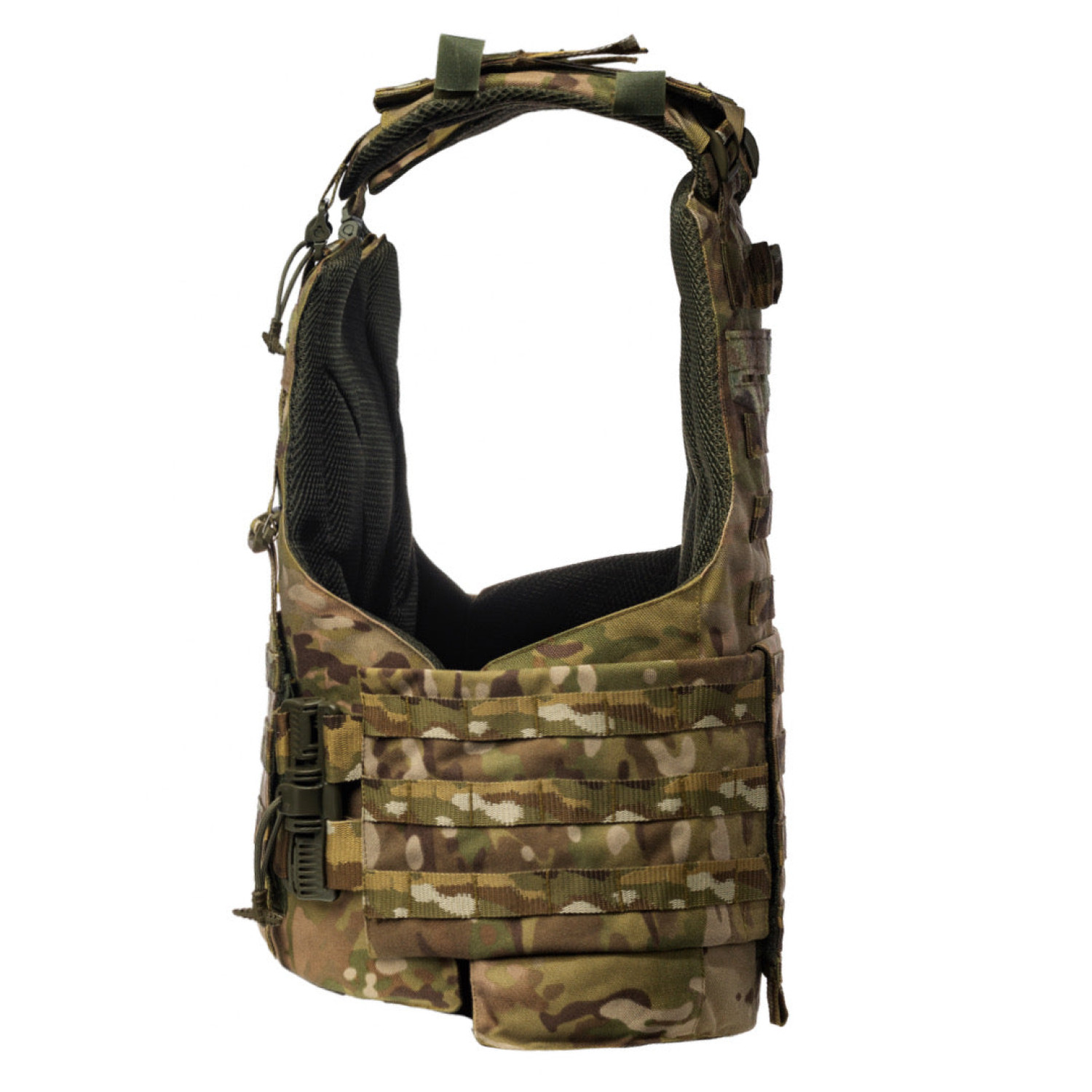 - Плитоноска має розширену область покриття тіла бійця, що дозволяє максимально збільшити захист від уламків за допомогою балістичного м'якого захисту.