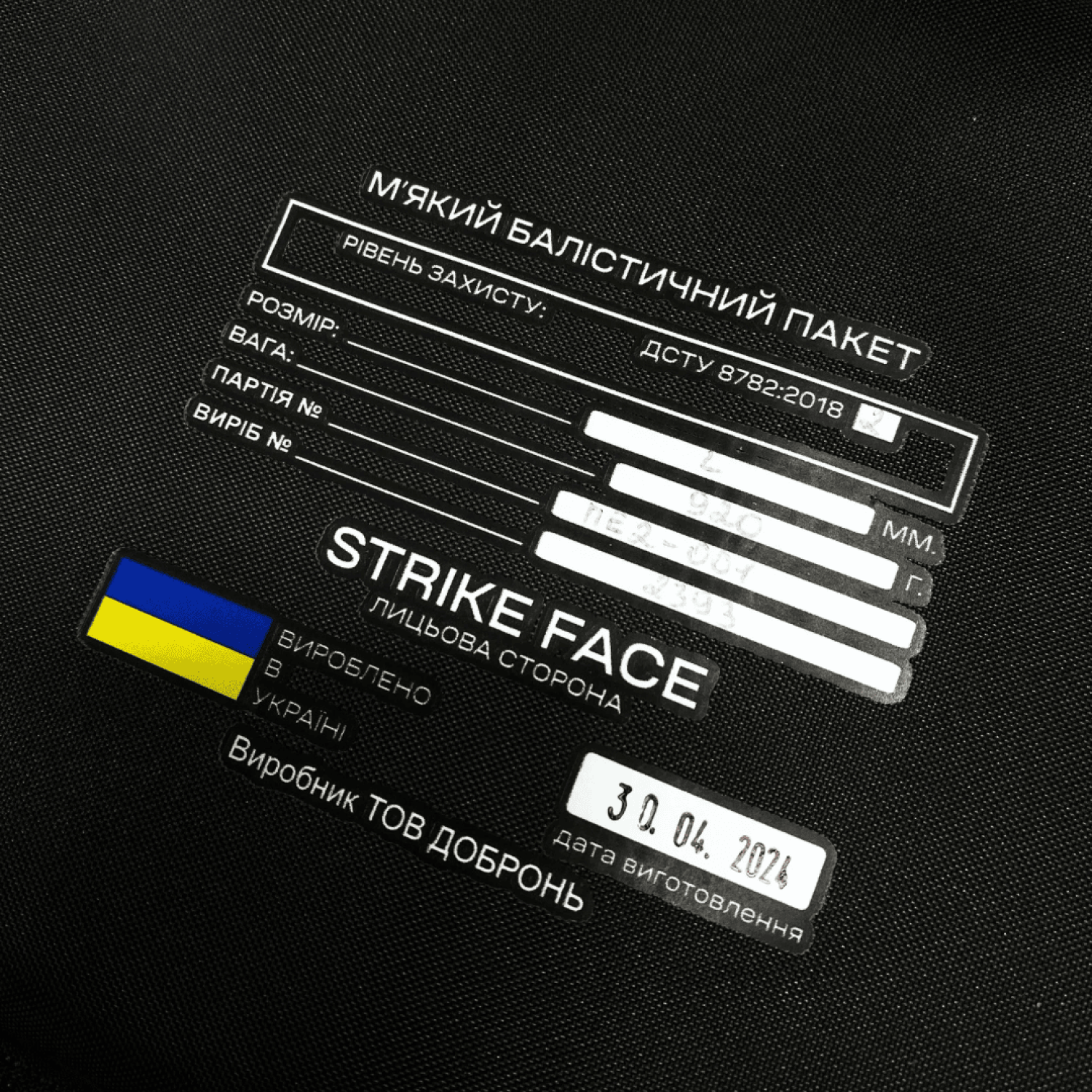 - Відповідає 1-му класу захисту ДСТУ 8782:2018. Витримує кулі 9х18 мм Макарова і 9х19 мм Luger зі швидкістю до 335±10 м/с.