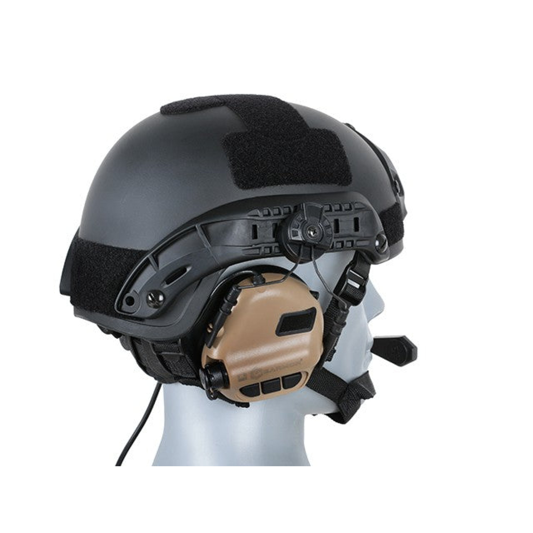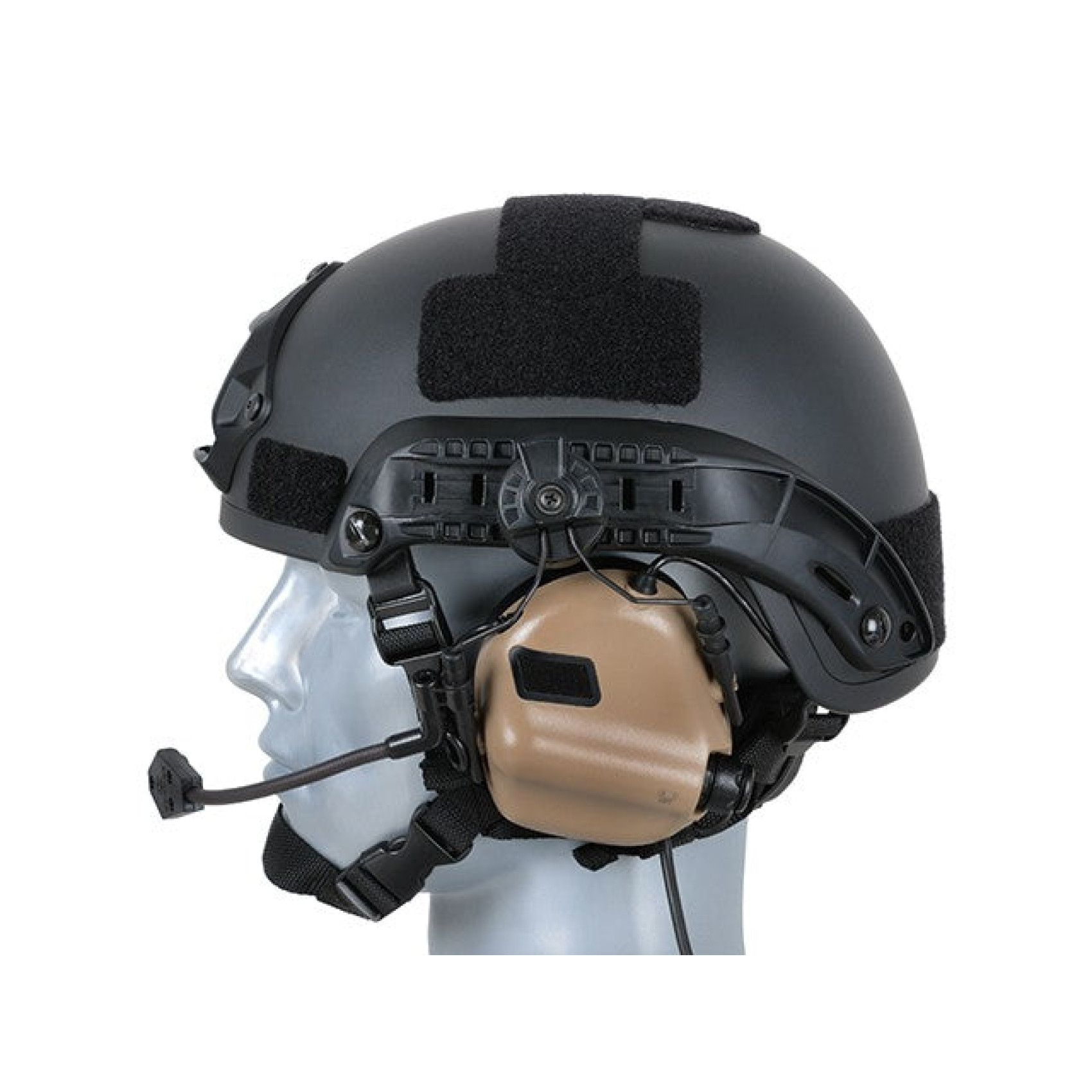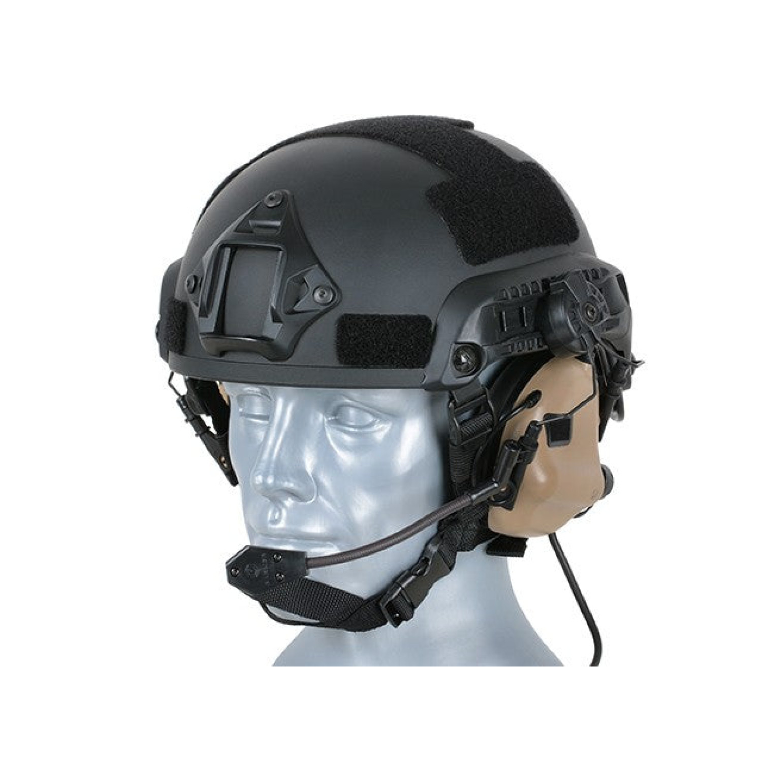 The Earmor M32H Mod 3 Coyote active headphones come with a side mount on the helmet and have a built-in 4-pin MIL-STD PTT connector (not compatible with Nexus TP-120 or Z-tac PTT), as well as a detachable microphone.