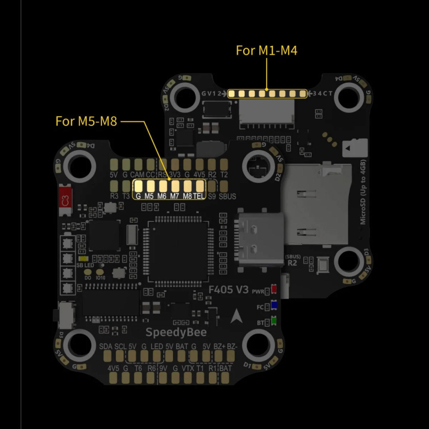 - ESC outputs: M1 - M4 on the bottom side and M5-M8 on the top