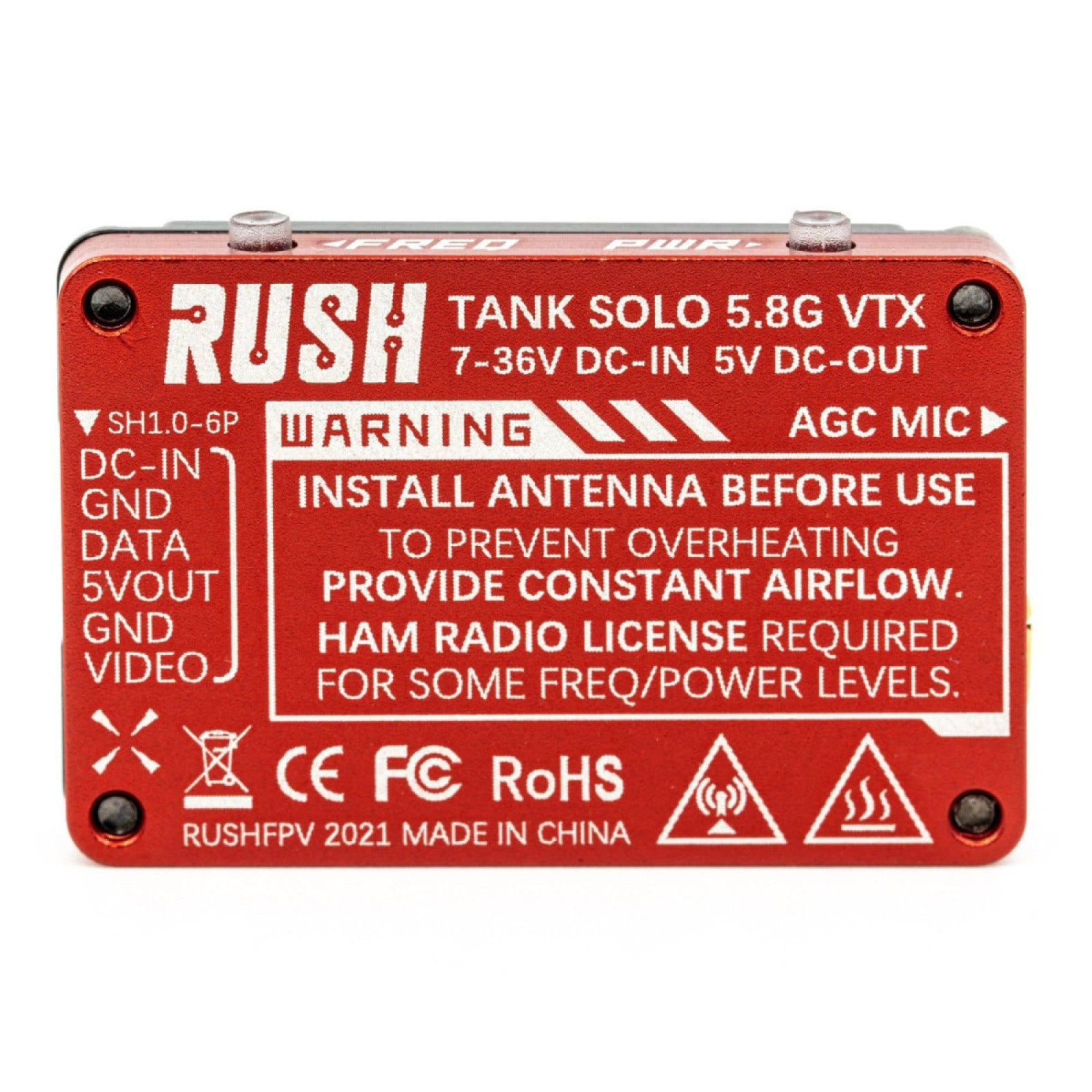 - High quality image transmission: The RUSH Tank Solo 5.8G video transmitter supports high-definition video transmission in 720p and 60 frames per second. This allows drone pilots to get a clear and detailed image even at high flight speeds.