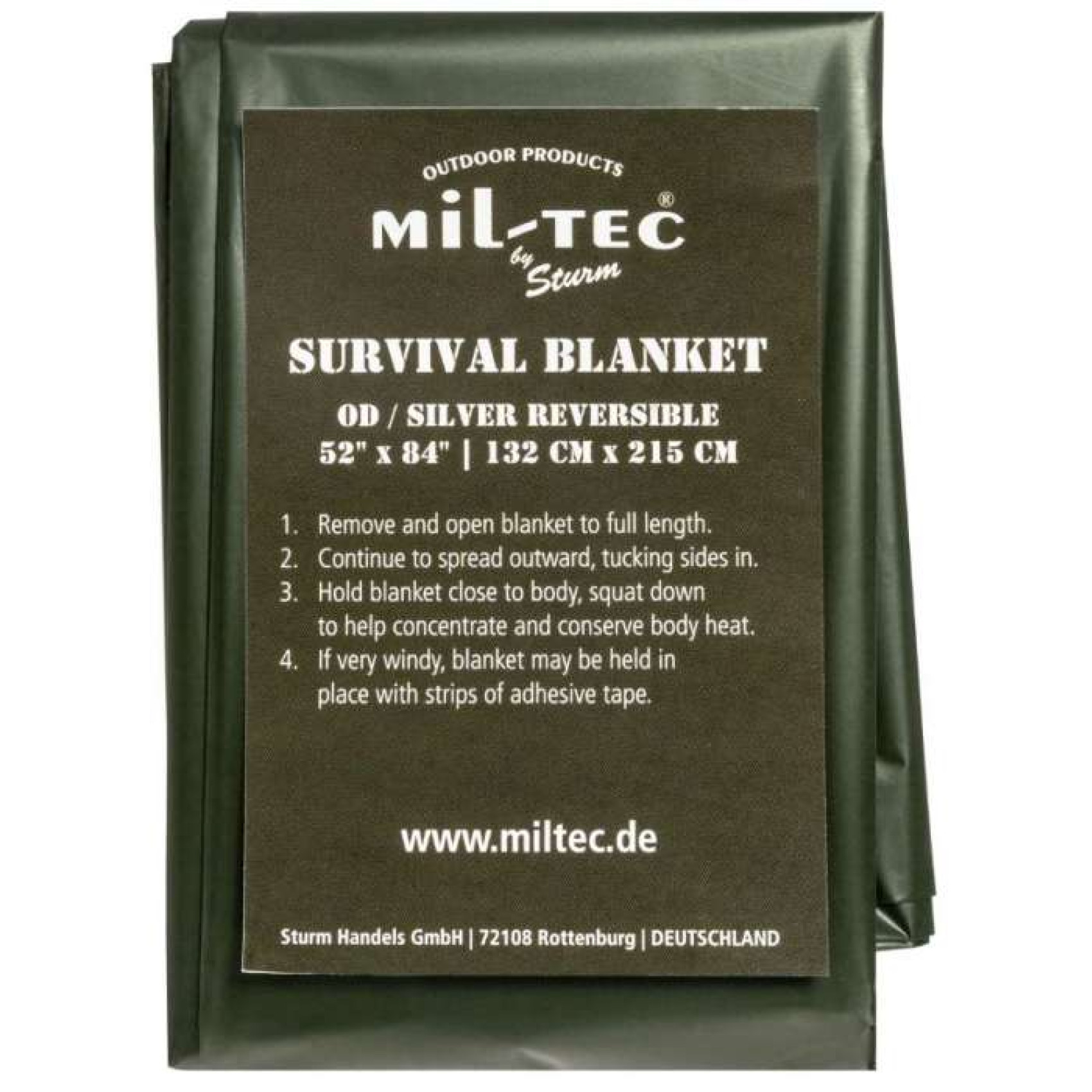 One side is edged with metal, and the other side has an olive-colored coating. Retains and reflects internal body heat.