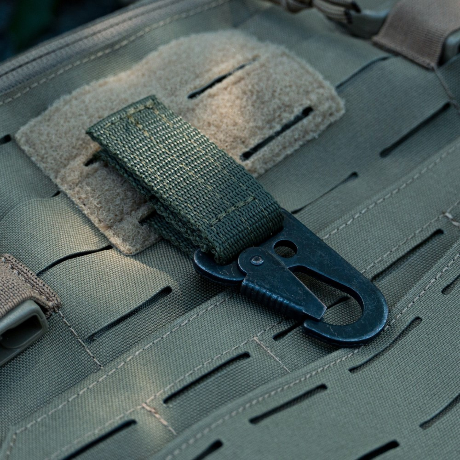 Universal mount with carabiner DEFua Olive (1 pc). A handy and multifunctional accessory that allows you to attach various bags/pouches with O or D ring attachments, tactical flashlights, GPS modules, multitools, etc. to your equipment. It can also be used as a keychain for keys or in conjunction with a safety cord for weapons. Made of a durable nylon sling, Velcro and a metal spring-type carabiner.