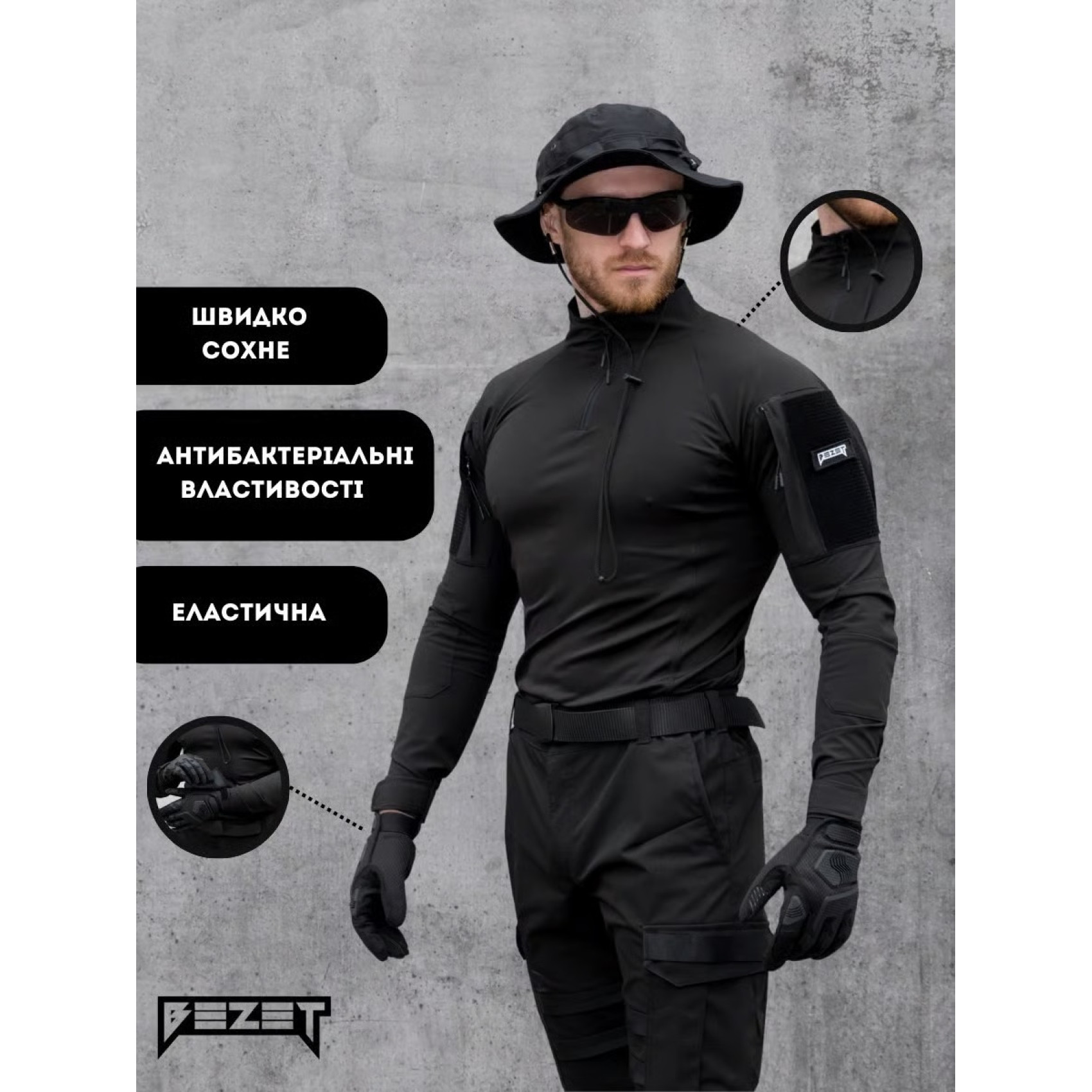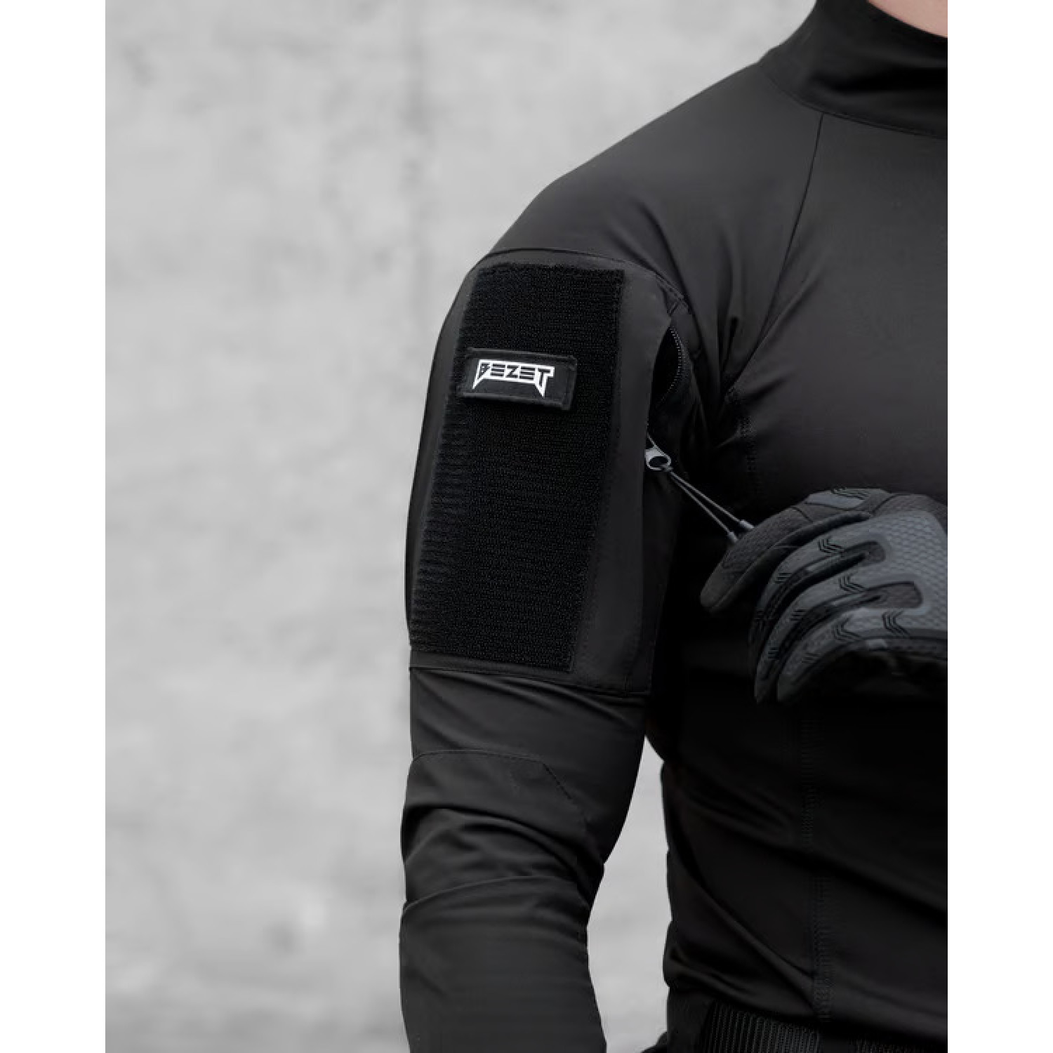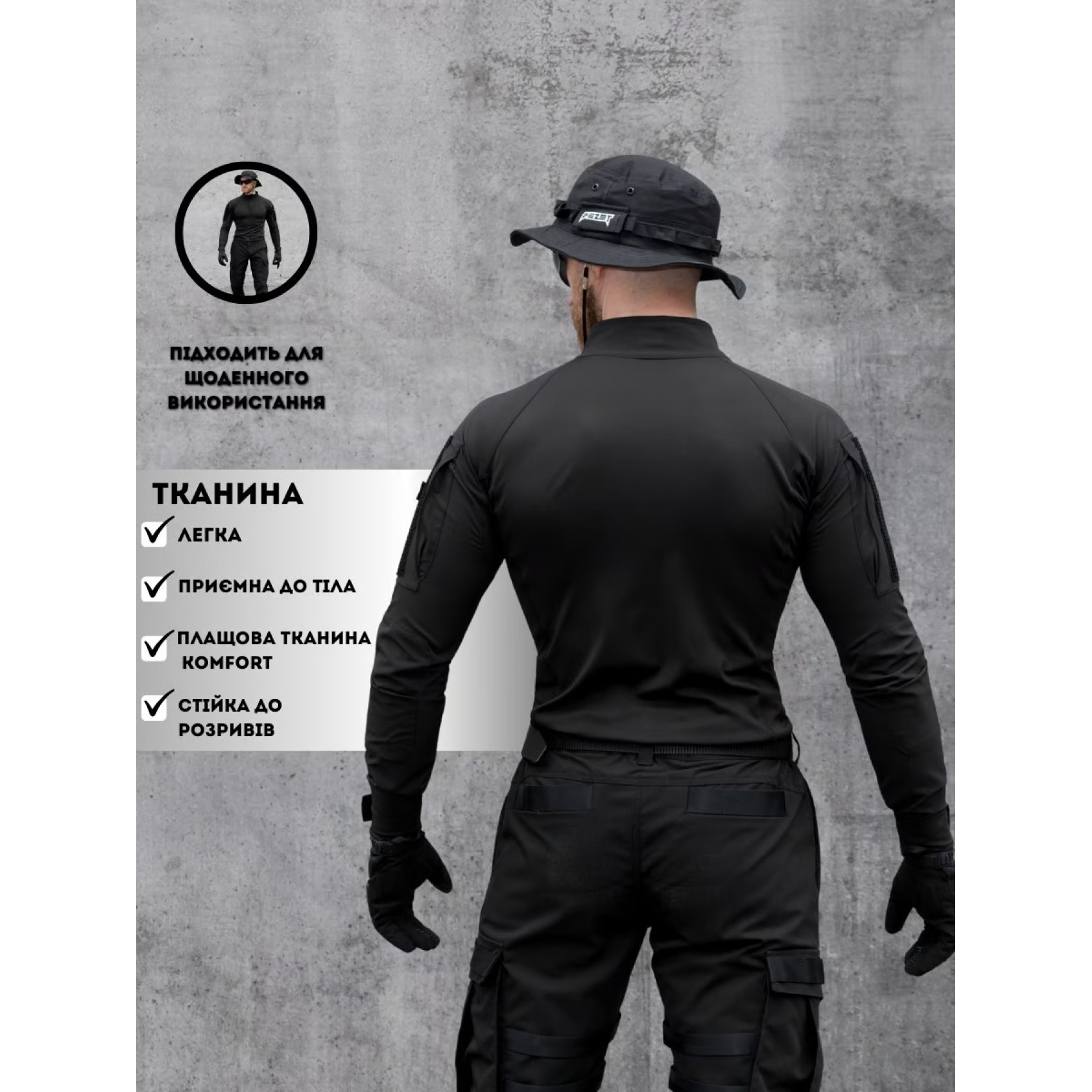Tactical shirt Bezet Combat Black with long sleeves and a high stand-up collar. The main part of the shirt is made of lycra, the sleeves and neck are made of Komfort raincoat fabric. The peculiarity of lycra is that it dries quickly, is easy to wipe, has antibacterial properties, is light and pleasant to the body. In turn, Komfort has a special double weave "Double Weav" with a mechanical stretch effect in 4 directions, which provides freedom of movement. Also, this fabric is resistant to tearing and wear, there is a water-repellent impregnation that perfectly protects against wind, sand, water and dries quickly. Both fabrics are used in sewing clothes for people involved in sports, tourism, or military activities.
