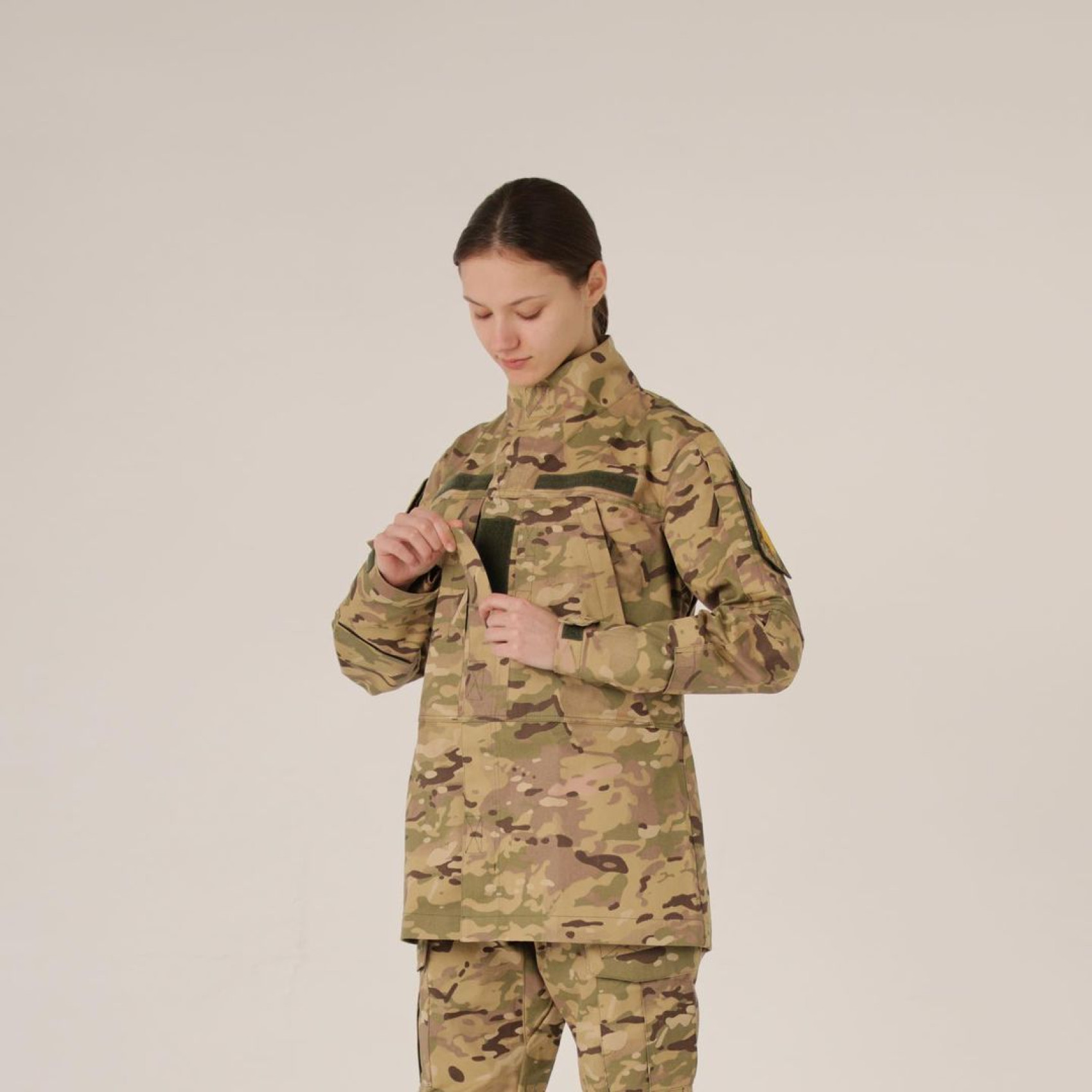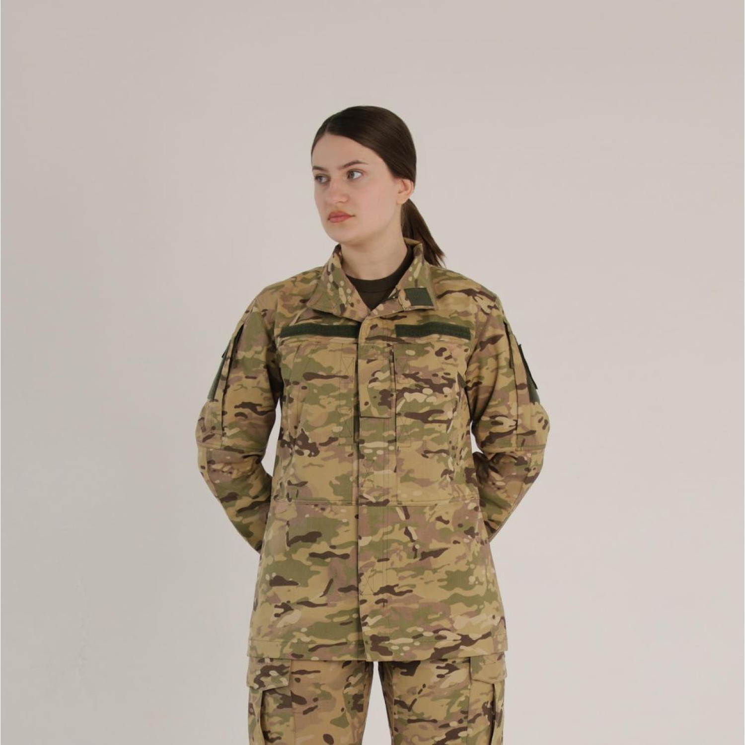 The women's jacket DFP Multicam is specially adapted for women, taking into account their anatomical features. It has a narrower waist and wider hips, distinguishing it from the male cut, which has straight lines. Nevertheless, it fully corresponds functionally to the male form. The coat features an internal pocket, right and left elbow patches, one pocket on each sleeve, as well as two pockets on the chest. Velcro fasteners on the sleeves allow for adjusting the wrist size for greater convenience. Additionally, Velcro patches are installed for attaching insignia: three on the chest and one on each sleeve. Now is the best time to buy a women's jacket DFP Multicam color!