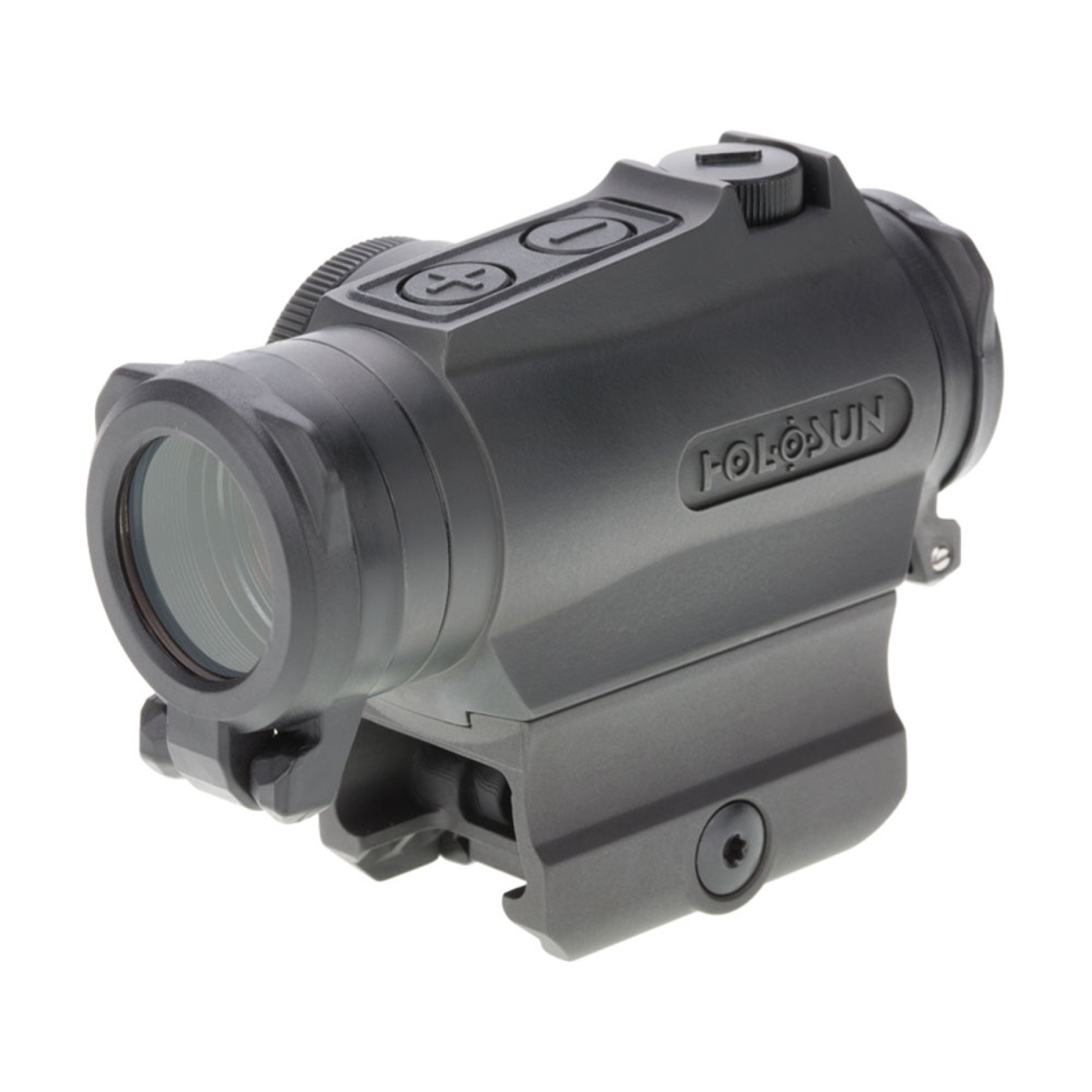 Collimator sight HOLOSUN HE515GT-GR is a high-tech and reliable device made in a titanium body. It is equipped with 20 mm diameter optics with full multicoated coating of all surfaces. A unique feature of this model is the hinged transparent caps on the lens and eyepiece, as well as the removable Killflash anti-reflective coating. This spotting scope also features electronic push-button control of the illumination brightness and the ability to install interchangeable reticles: a point (2 MOA) or a 2 MOA point in a 65 MOA circle. Holosun's proprietary green Super LED provides a comfortable perception that guarantees maximum convenience when aiming at a target. Shake Awake™ technology enables up to 50,000 hours of operation on a single battery charge by turning the backlight on when vibration is detected and off when it is at rest.