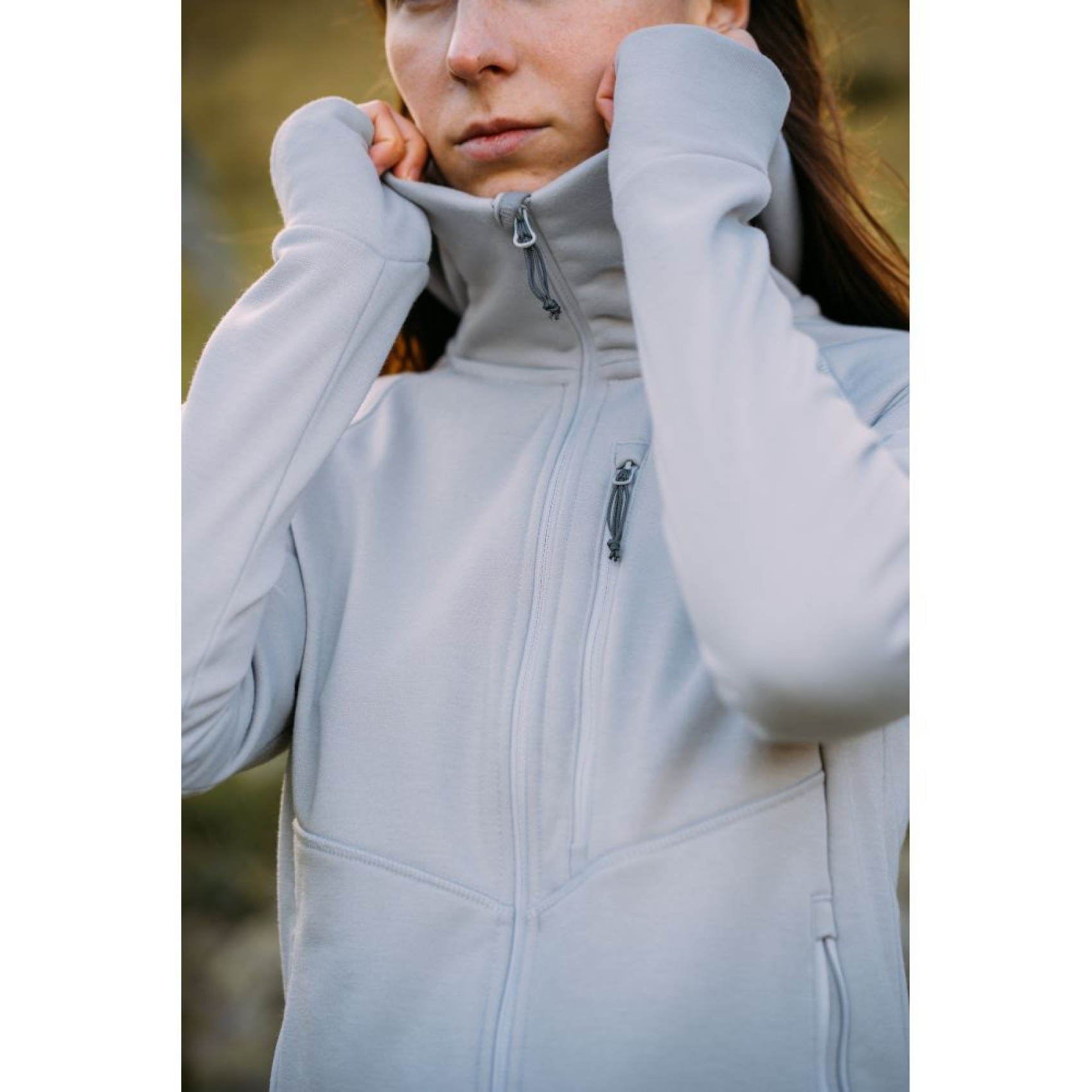 Turbat Peak Wmn Fleece Jacket Grеy with ergonomic hood and high neck protection up to the chin. Designed for trekking in the mountains, traveling and winter sports. Thanks to its casual look, the fleece will be appropriate even for everyday use in the city.