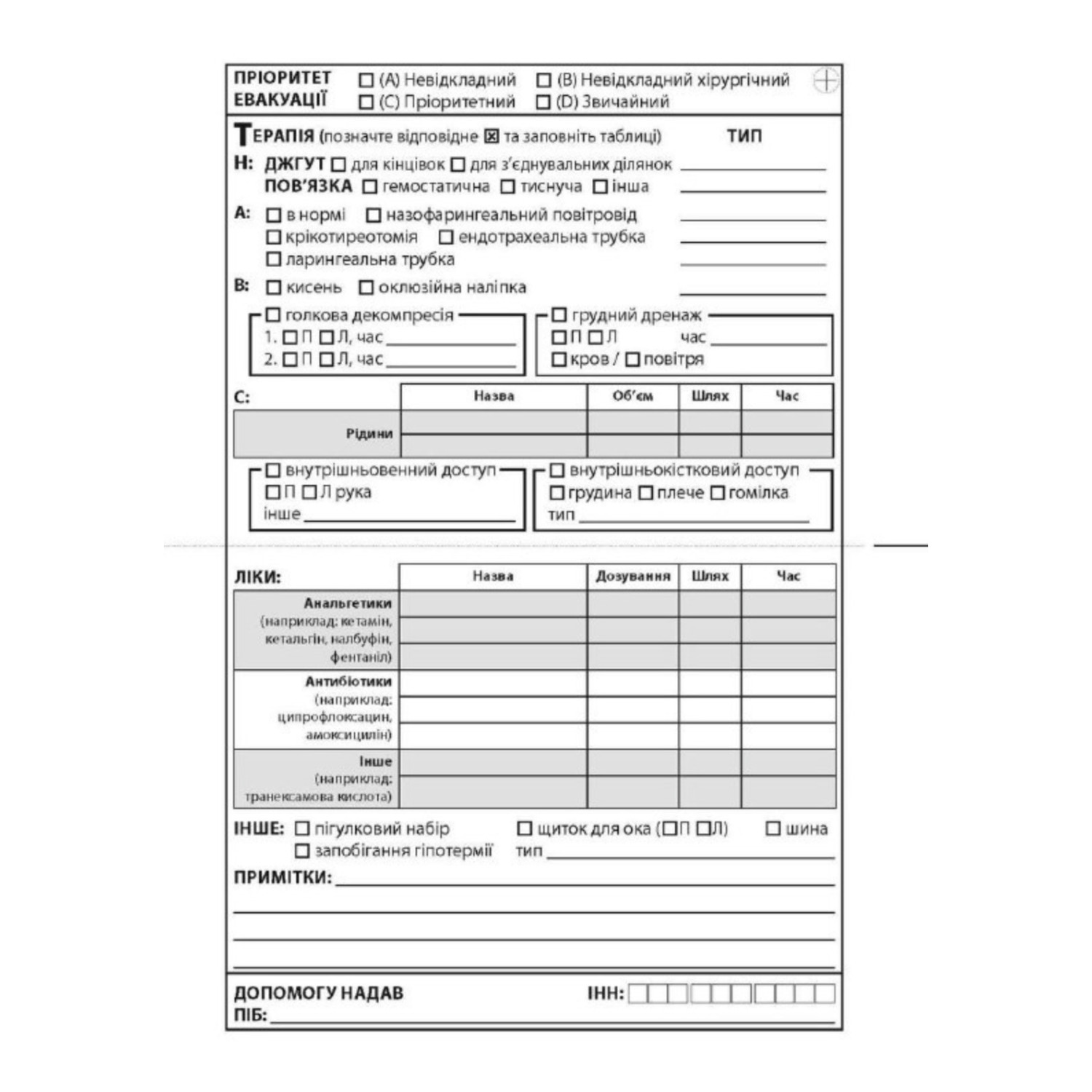 Медична картка пораненого Paramedic TCCC відноситься до первинної медичної документації і містить всю інформацію про постраждалого бійця, отримані травми та надану допомогу, і супроводжує постраждалого на всіх етапах евакуації. Ця інформація дуже важлива для правильного подальшого лікування. Заповнюватися повинно перманентним маркером, який є в комплектації тактичної аптечки.
