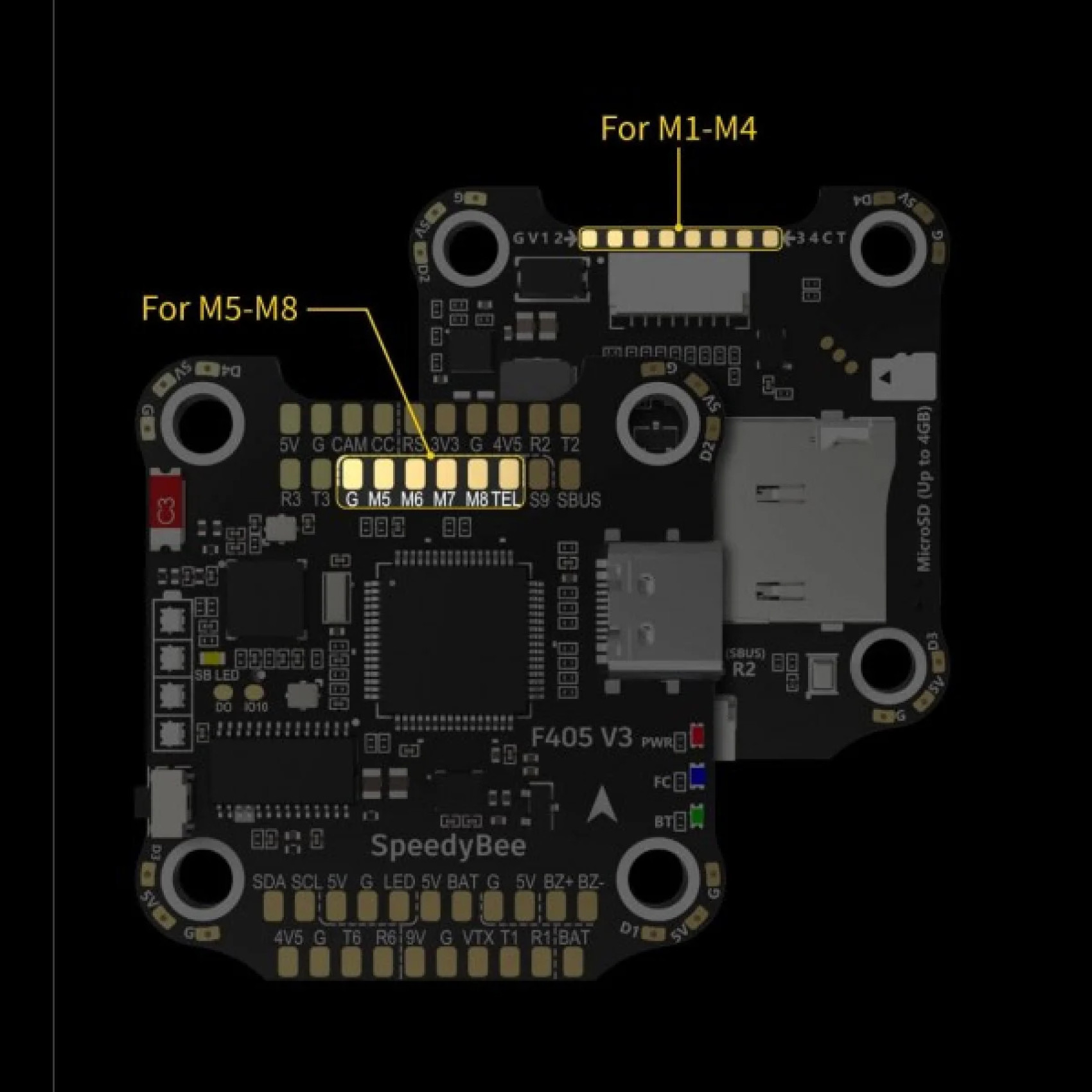 - ESC выходы: M1 - M4 на нижней стороне и M5 - M8 на верхней