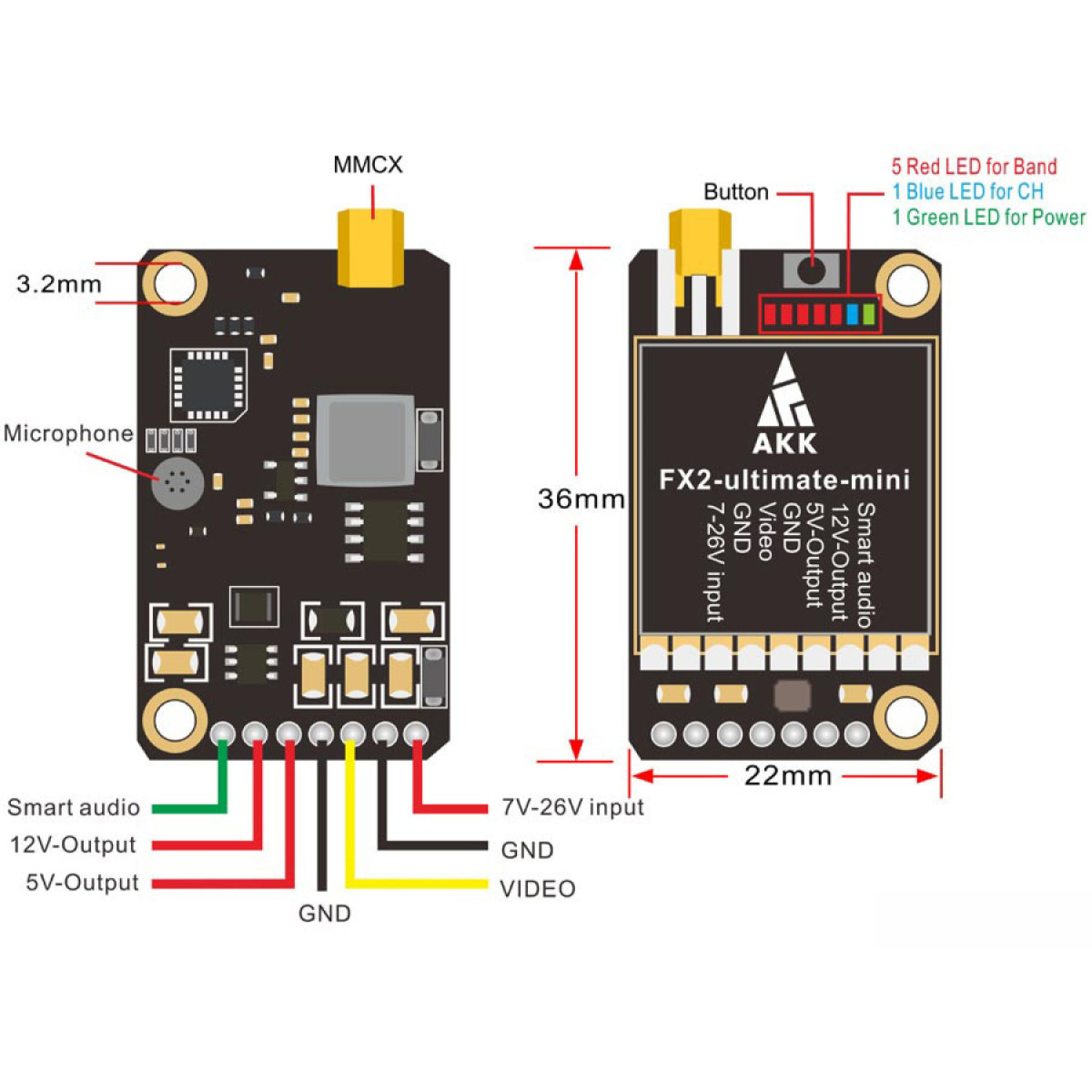 Видеопередатчик для FPV AKK FX2-ultimate-mini 25/200/600/1200mW 5.8G отличается от обычной версии AKK FX2-ultimate уменьшенными размерами и сокращенным количеством монтажных отверстий до двух для более удобного крепления на раму. На плате этого устройства предусмотрено два встроенных модуля BEC на 5V и 12V, предназначенные для питания FPV камеры. Также следует отметить отсутствие гнезд для пин-коннекторов: все кабели теперь соединяются напрямую. Кнопка переключения сетки, частоты и мощности перемещена в верхнюю часть платы, а аналоговый дисплей заменен на светодиодные индикаторы. Новая версия видеопередатчика для FPV AKK FX2-ultimate-mini 25/200/600/1200mW 5.8G сохраняет все функциональные особенности предыдущей модели, обеспечивая при этом более компактный и удобный дизайн.