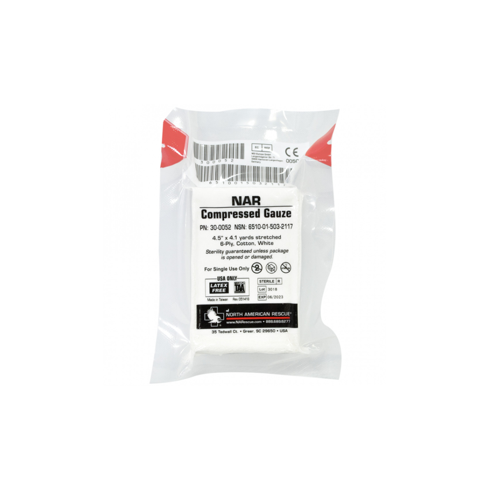 Compressed Gauze from North American Rescue (NAR) is an ultra-compact roll of sterile high quality sterile 100% cotton gauze with a unique folded fabric that absorbs fluid perfectly. It is a 6-ply, 11.5 cm x 375 cm gauze with treated edges to reduce loose ends or lint. The gauze is designed to treat bleeding as well as wound dressings.