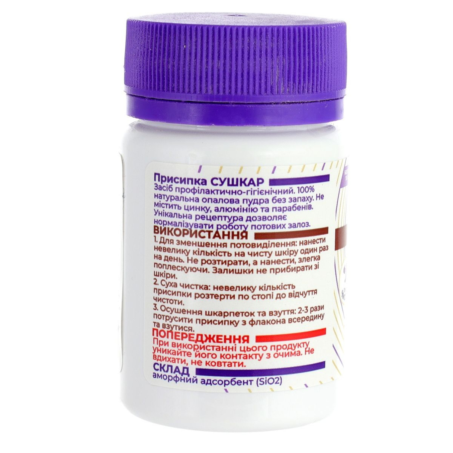 Присыпка для ног, носков, обуви Сушкарь 60мл разработана для осушения и очищения вашей кожи в экстремальных условиях. Этот природный адсорбент не только обеспечит вам комфорт и сухость, но и нормализует функцию потовых желез, придавая уверенность в течение всего дня. Каждая баночка содержит 60 мл присыпки, достаточной для длительного использования. Подарите своим ногам лучшее - выберите Сушкар для абсолютного комфорта каждый день.