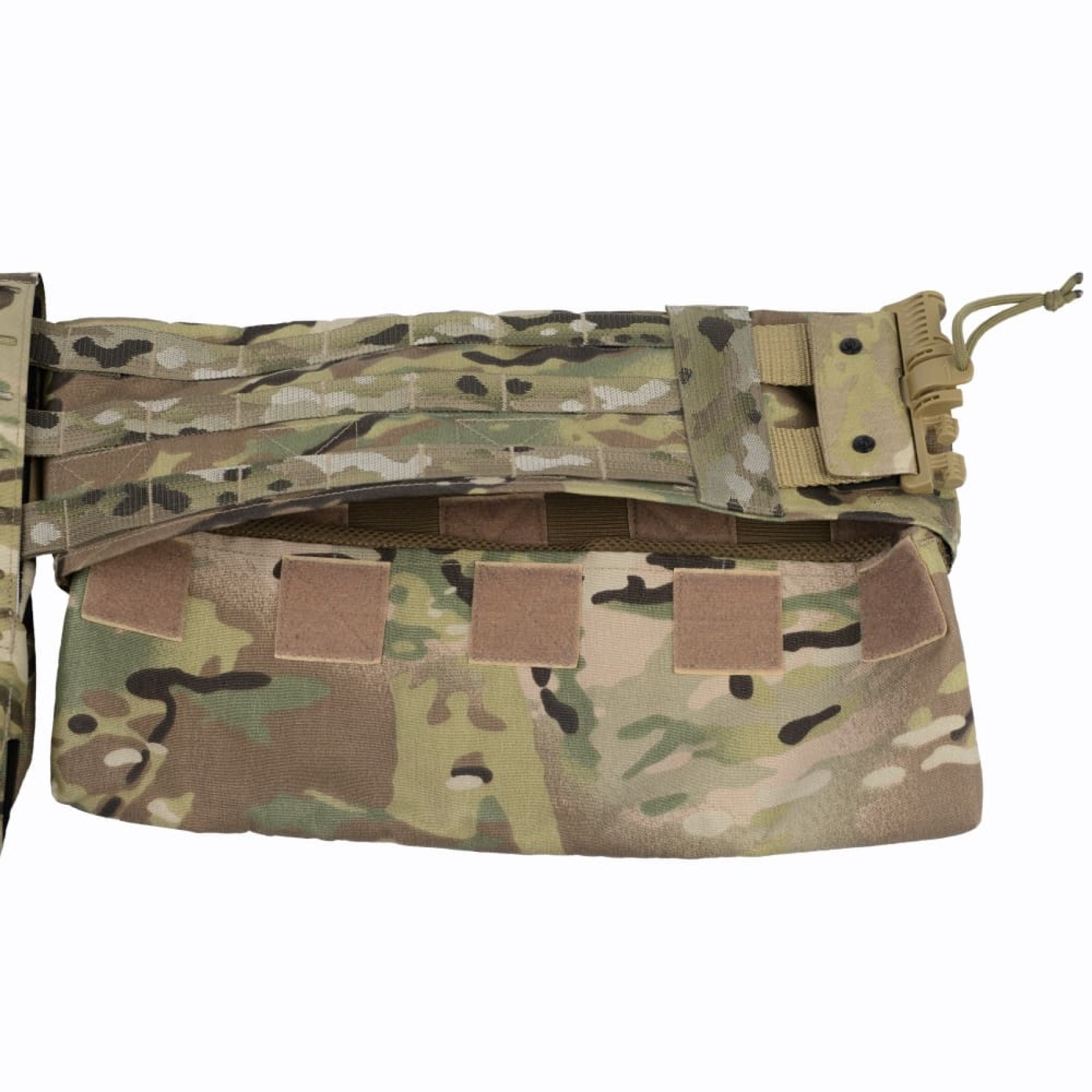 Камербанд со встроенными карманами для баллистических пакетов также регулируется под пакеты разных размеров и производителей (минимальный допустимый размер 12х20, а максимальный 20х42). Для того, чтобы правильно зафиксировать объем используйте Velcro элементы на верхней и нижней частях камербанда. В комплекте данной плитоноски Мультикам поставляется мягкий демпфирующий элемент из изолона, который при необходимости можно подрезать по высоте вашего баллистического пакета. Для пакетов меньше 42 см, рекомендуется также подрезать верхний слой изолона в соответствии с длиной пакета, чтобы тот был зафиксирован в середине демпфера по принципу «ковша».