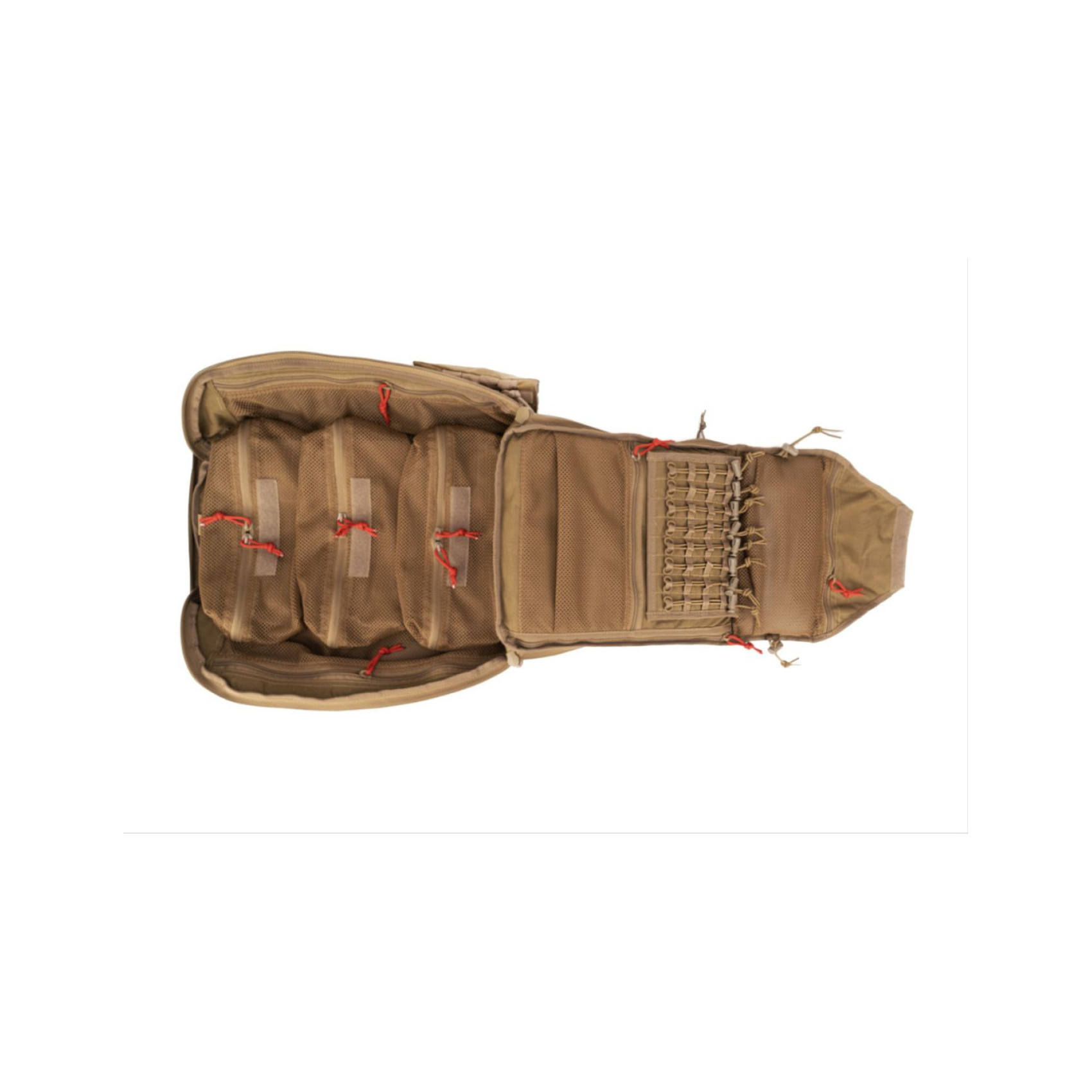 - Снаружи на фронтальной части рюкзак имеет два кармана быстрого доступа: один небольшой горизонтальный (в который помещаются гемостатические средства) и один сквозной вертикальный карман, доступ к которому возможен как снаружи, так и изнутри рюкзака (что может быть полезно для транспортировки жгутов и перевязки, которые могут вам понадобиться как при первичном, так и при детальном осмотре раненого). Внешние карманы рекомендуется использовать для медицинского снаряжения первой необходимости, например, гемостатиков и жгутов.