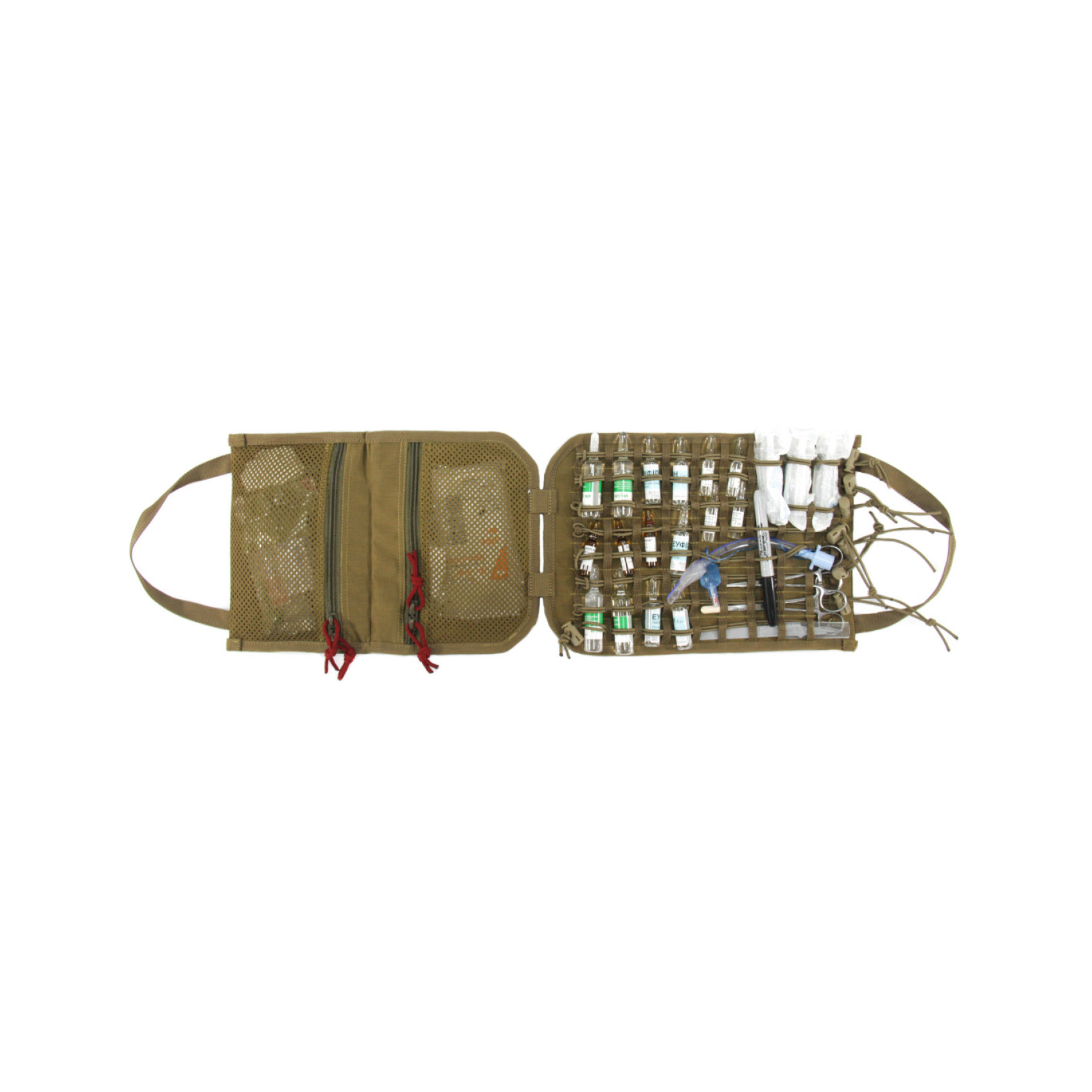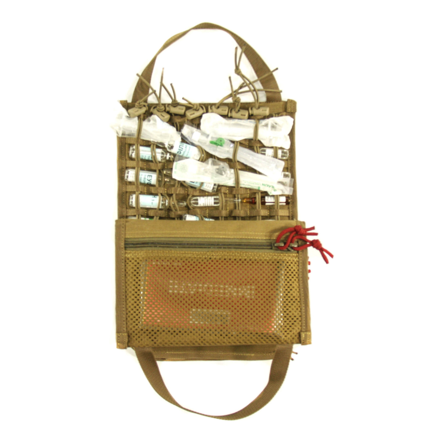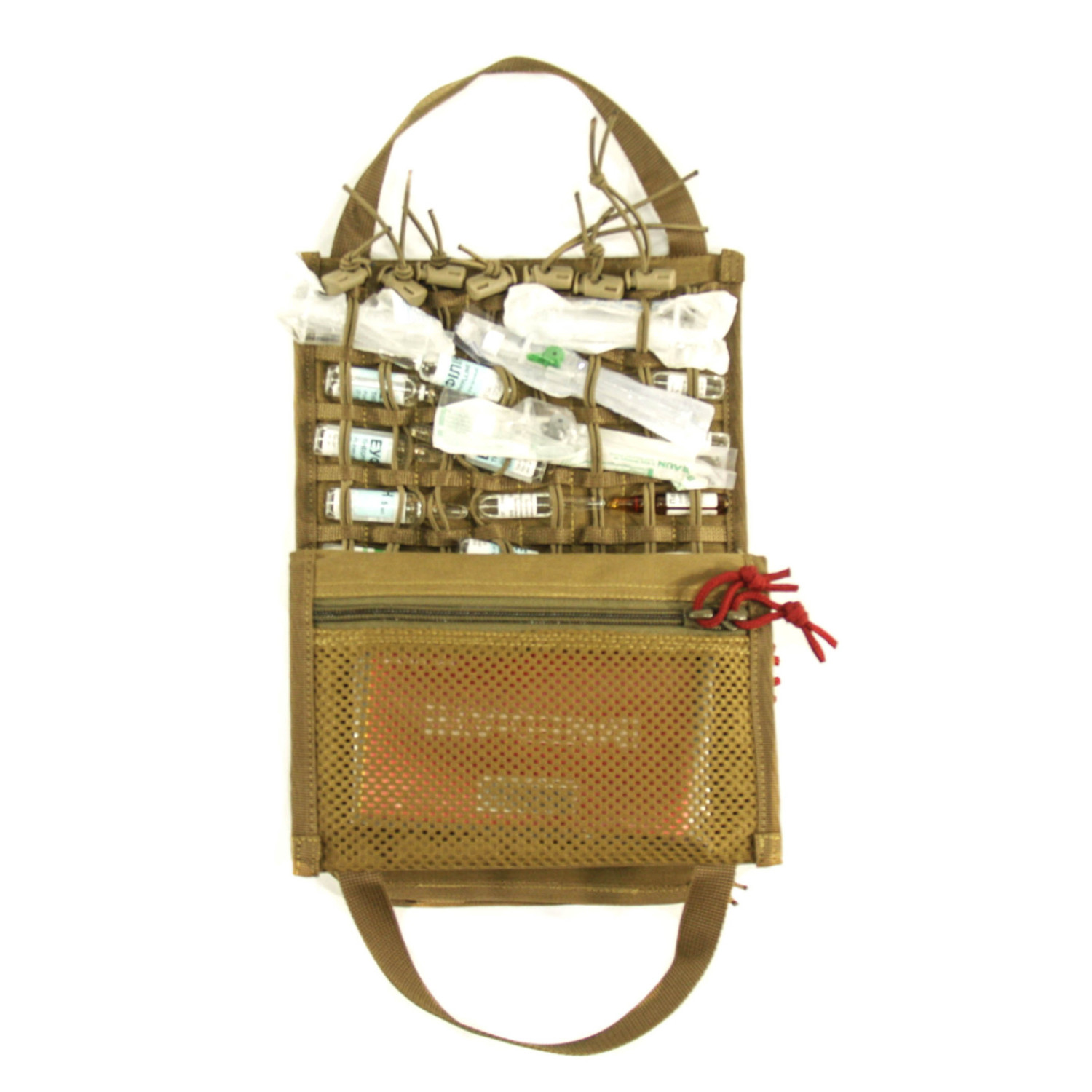 - Медицинский вкладыш-пенал, состоящий из двух объединенных между собой панелей. Задняя содержит систему строп и резинок, в которой можно надежно фиксировать ампулы любого размера (при этом оставляя видимыми надписи названий), шприцы, малый хирургический инструмент и негабаритное имущество типа интубационных трубок и прочее. Передняя панель имеет два плоских сетчатых эластичных кармана, которые прекрасно подойдут для салфеток, пластырей и другого негабаритного плоского имущества.