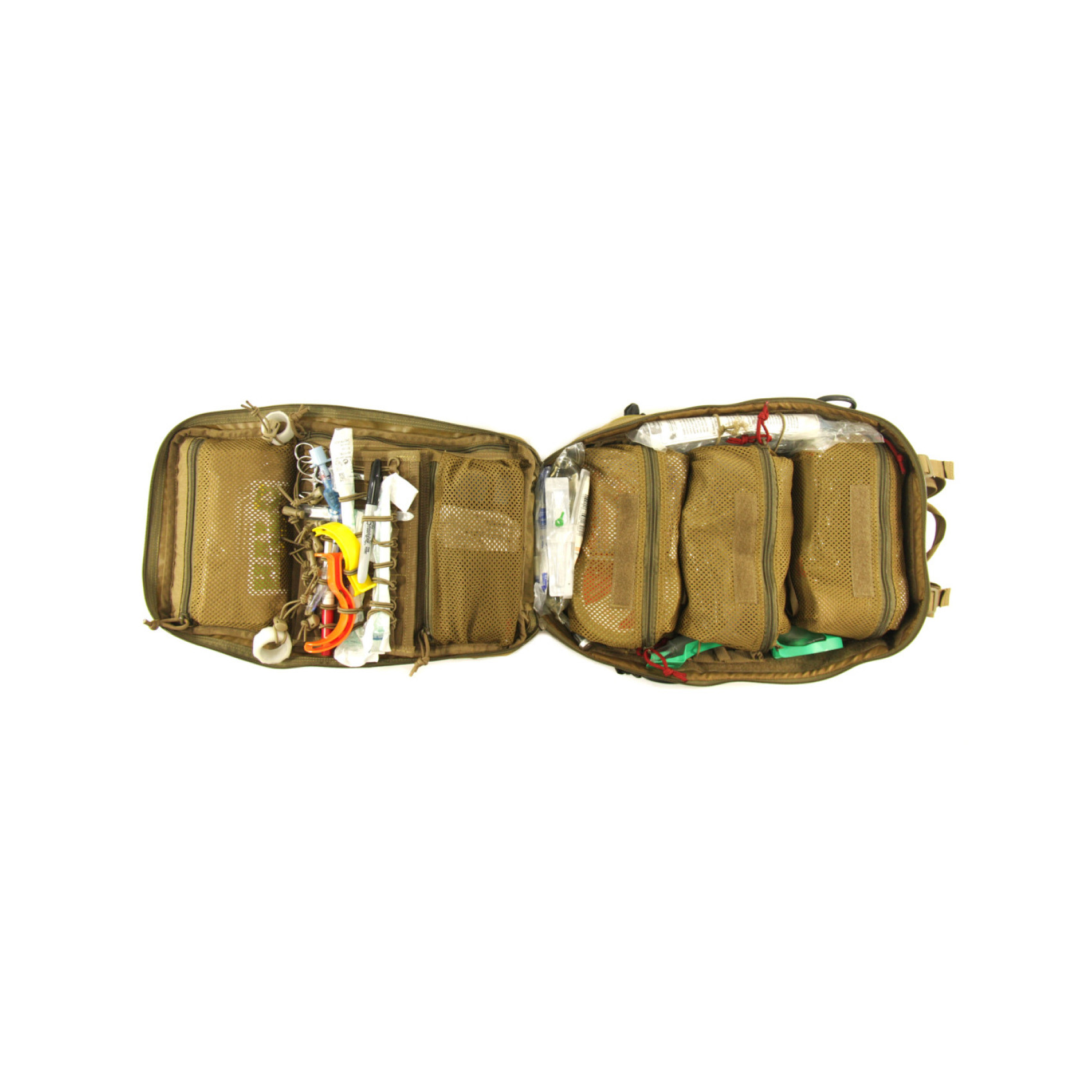 - Снаружи на фронтальной части рюкзак имеет два кармана быстрого доступа: один небольшой горизонтальный (в который помещаются гемостатические средства) и один сквозной вертикальный карман, доступ к которому возможен как снаружи, так и изнутри рюкзака (что может быть полезно для транспортировки жгутов и перевязки, которые могут вам понадобиться как при первичном, так и при детальном осмотре раненого). Внешние карманы рекомендуется использовать для медицинского снаряжения первой необходимости, например, гемостатиков и жгутов.