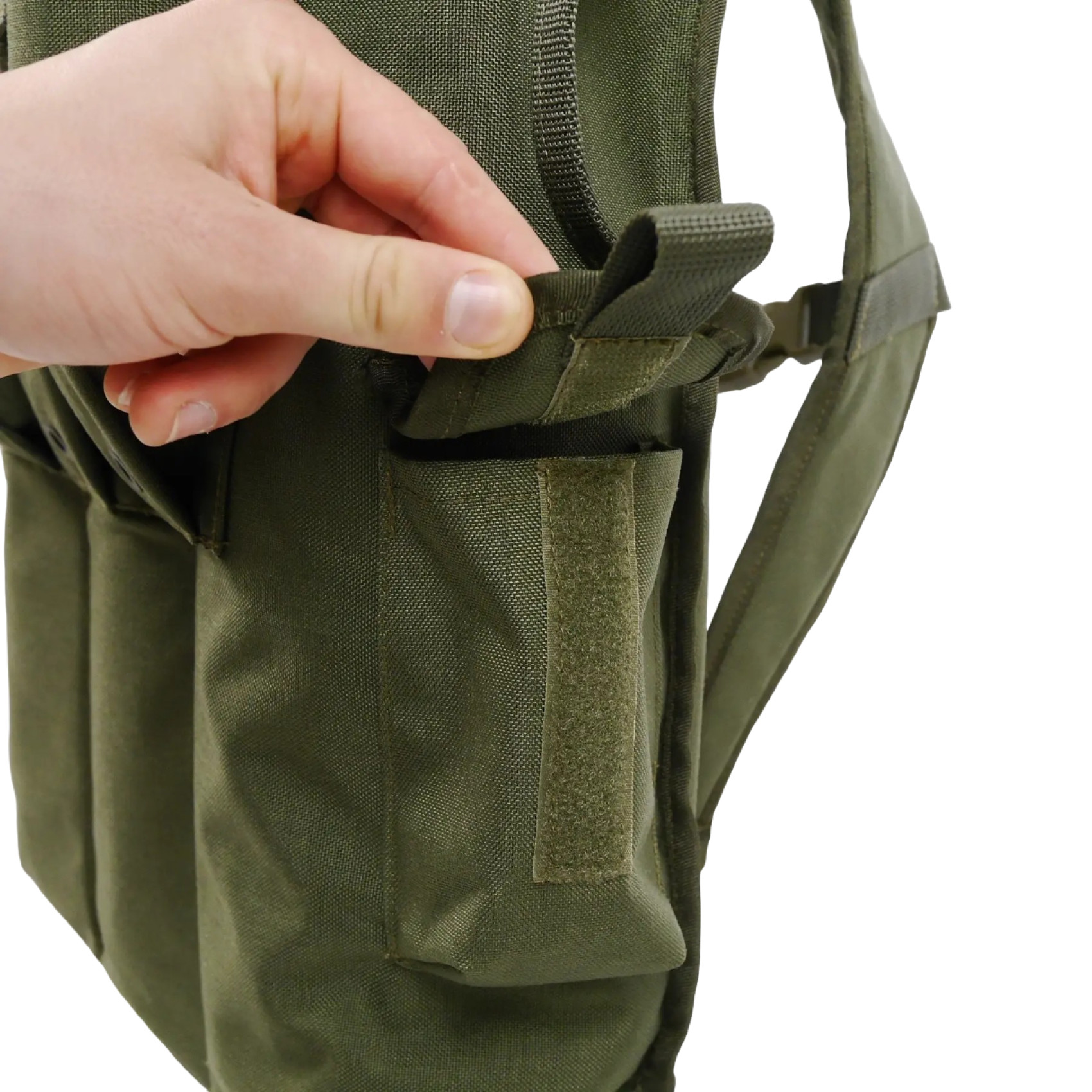 Внутри он разделен на три основных отсека для хранения выстрелов РПГ-7 и оборудован тремя отверстиями для пороховых зарядов. На правом боку имеется дополнительный карман на липучке.