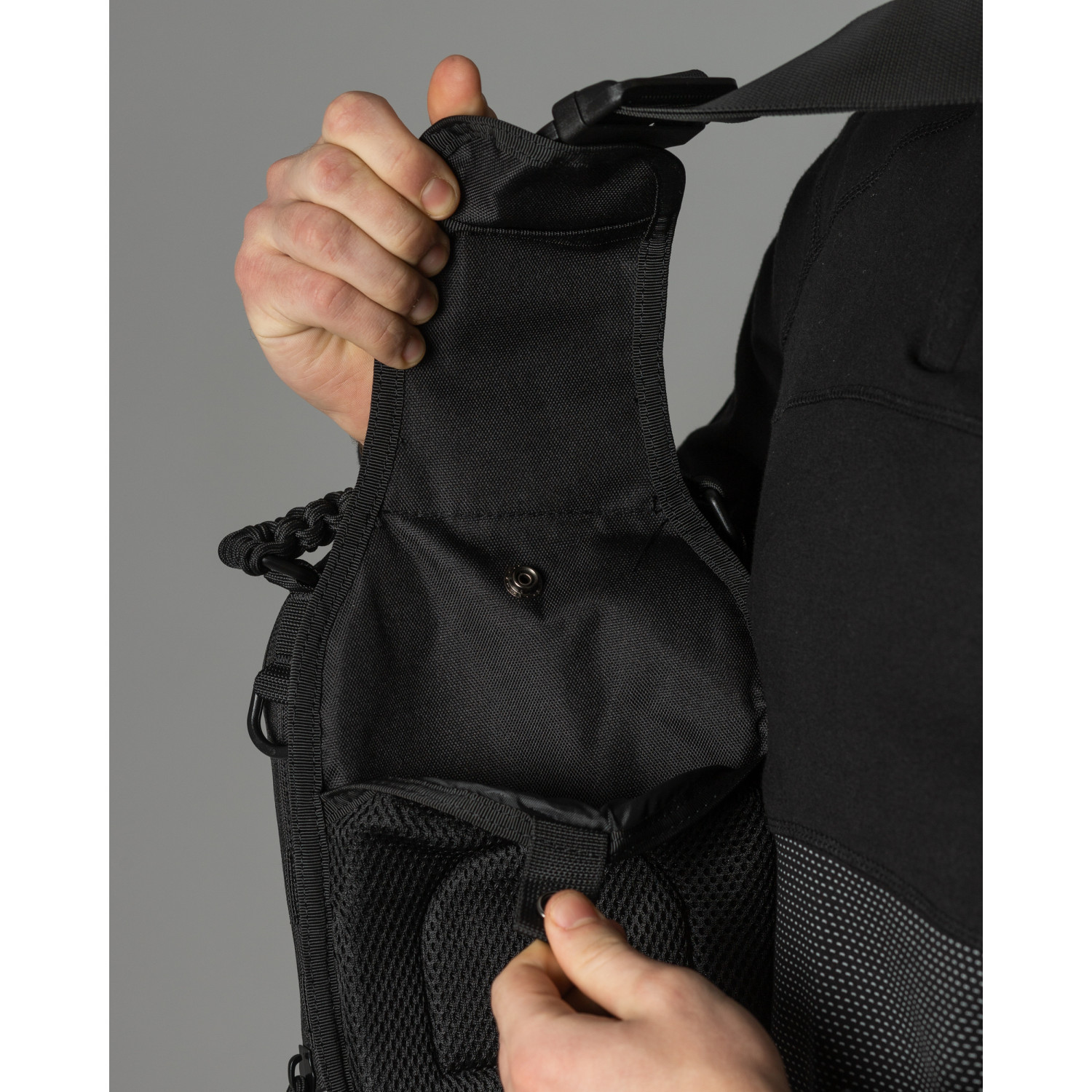 - Спереди размещена двойная накладной карман с системой molle (на которую можно разместить аксессуары на клипсе, карабины) и липучка для шевронов с дополнительным эластичным шнурком для крепления важных вещей;
