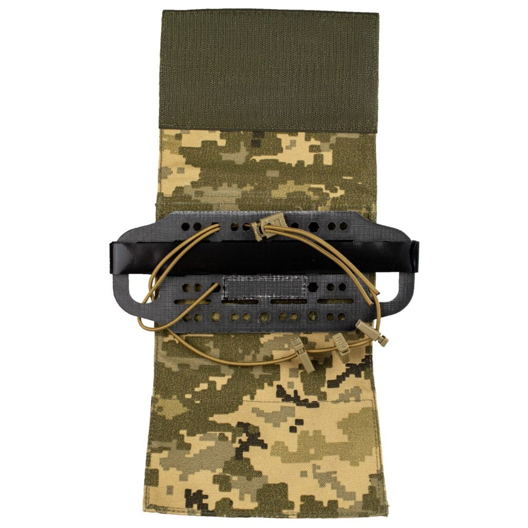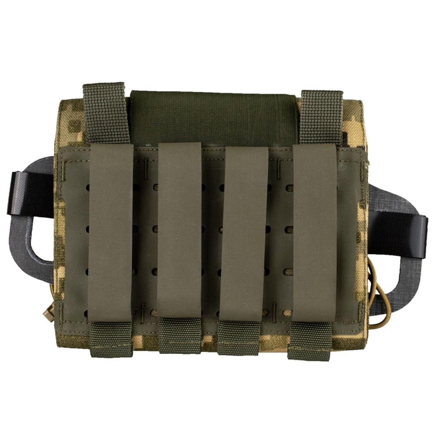 Панель-органайзер из композита Tegris (может быть заменена на аналогичный Curv) на Velcro имеет 4 столбика по 3 ячейки Molle, и дополнительные отверстия для шок-корда и Velcro стяжек, с помощью которых фиксируется содержимое подсумка.