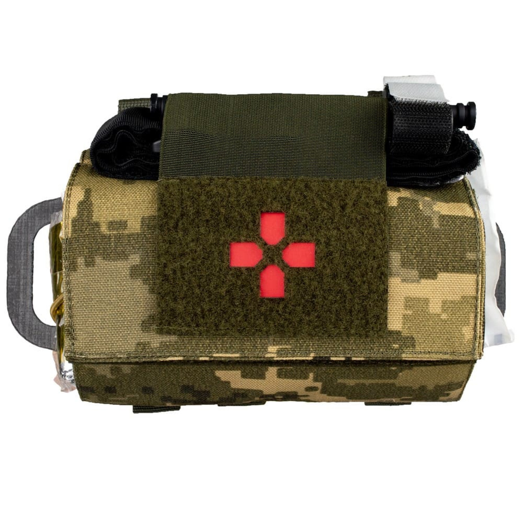 Сверху подсумок оснащен эластичной резинкой для фиксации дополнительного турникета и Velcro панелью для патчей. Пластиковая цветная вставка под вырезом медицинского креста является съемной, что помогает повысить уровень маскировки.