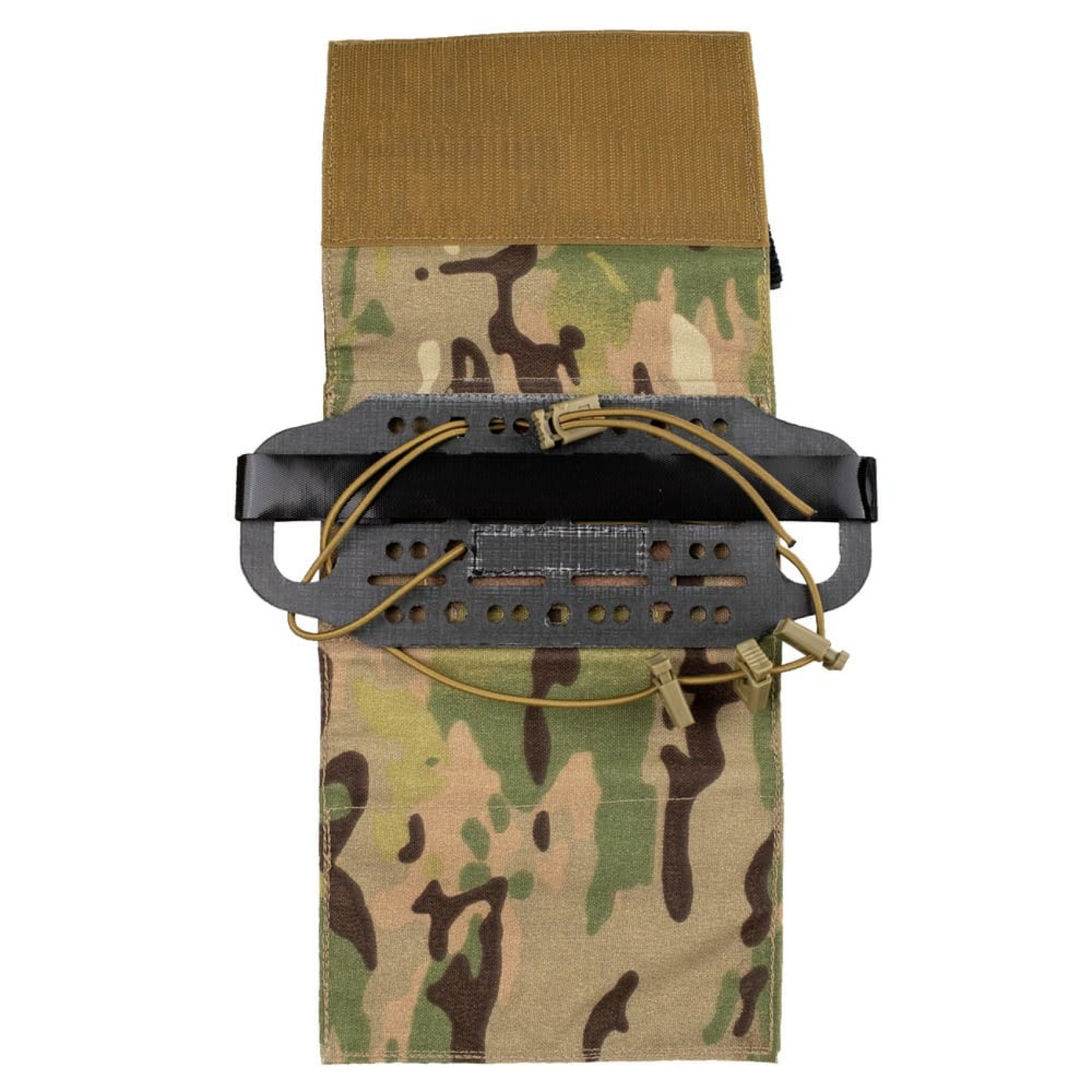 Панель-органайзер из композита Tegris (может быть заменена на аналогичный Curv) на Velcro имеет 4 столбика по 3 ячейки Molle, и дополнительные отверстия для шок-корда и Velcro стяжек, с помощью которых фиксируется содержимое подсумка.