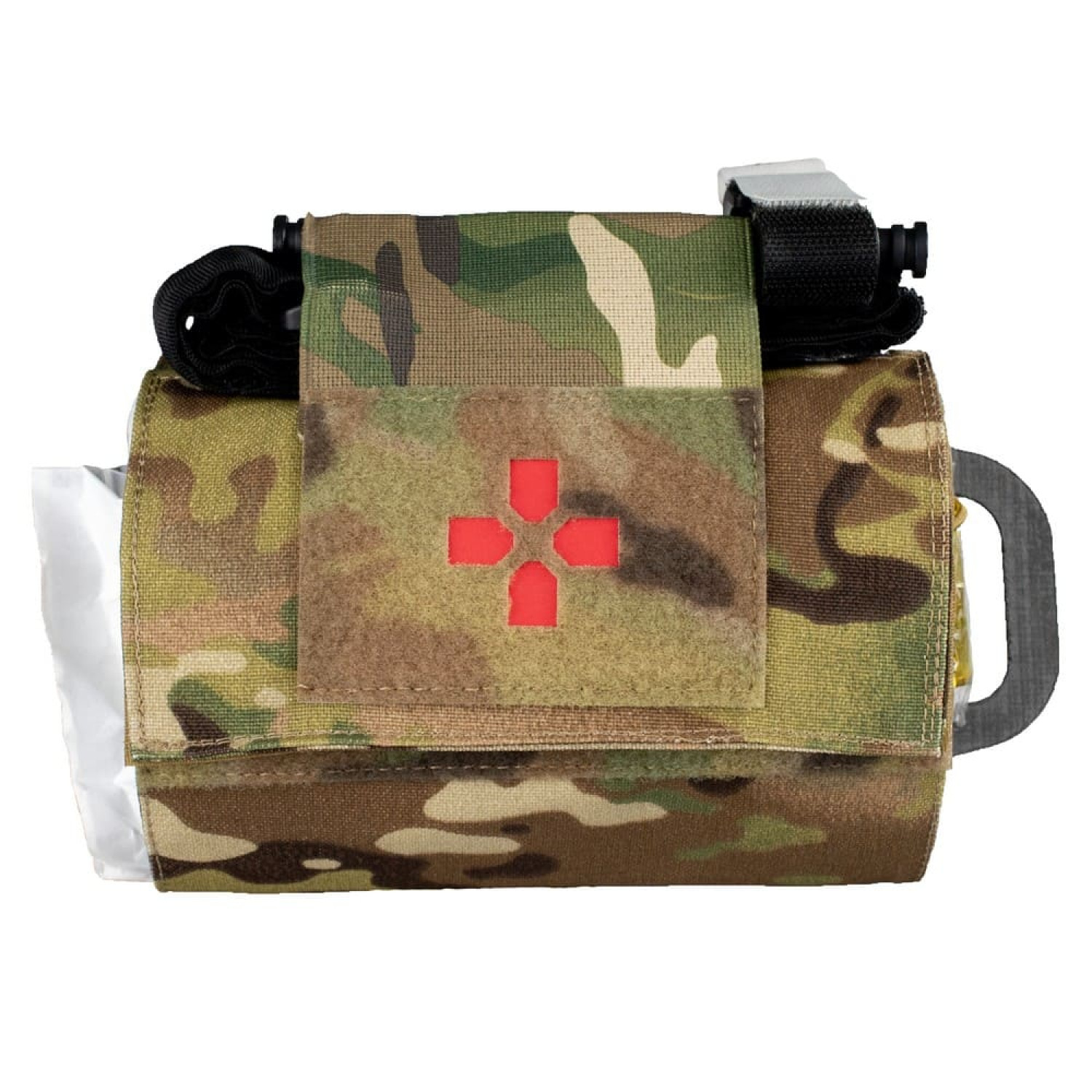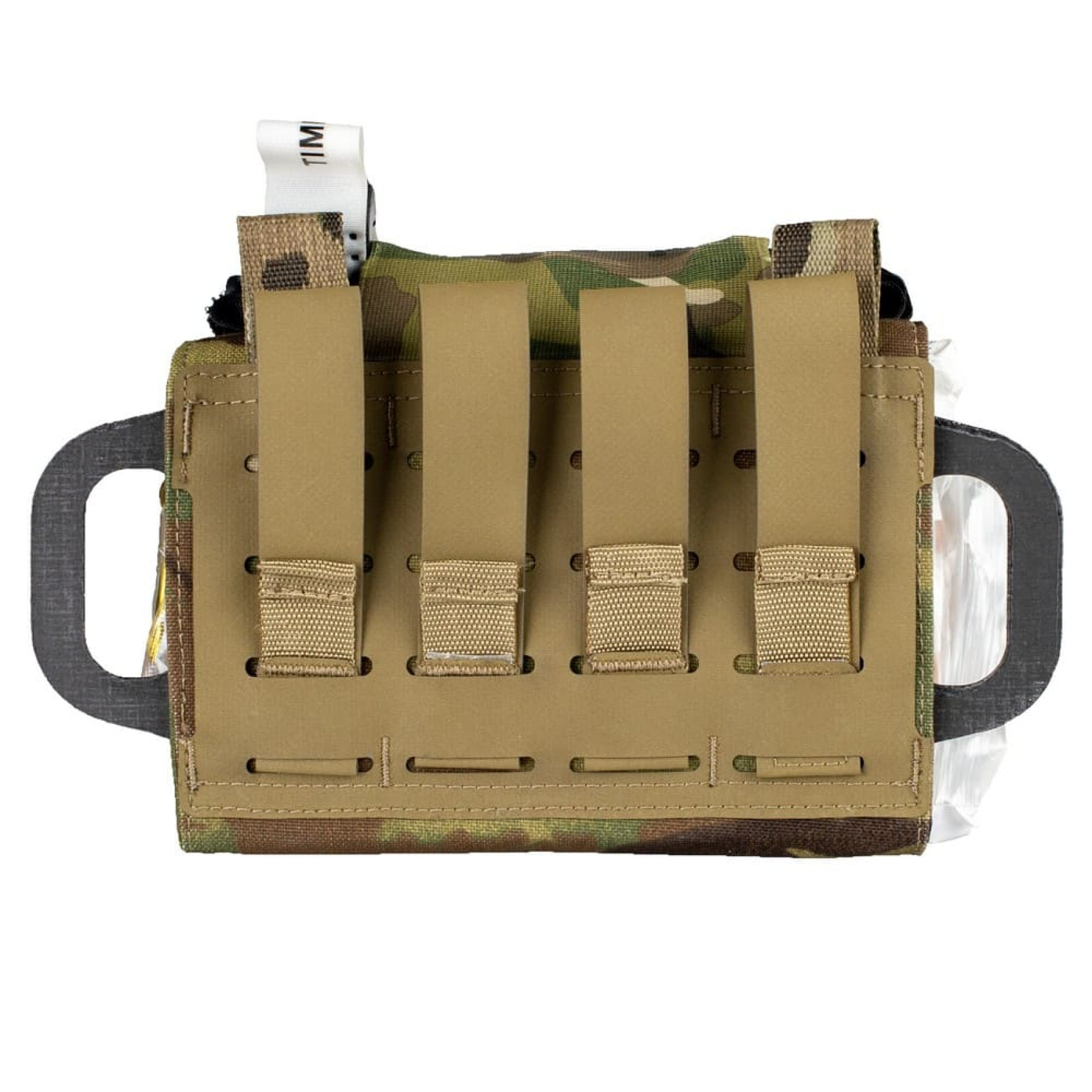 Сверху подсумок оснащен эластичной резинкой для фиксации дополнительного турникета и Velcro панелью для патчей. Пластиковая цветная вставка под вырезом медицинского креста является съемной, что помогает повысить уровень маскировки.