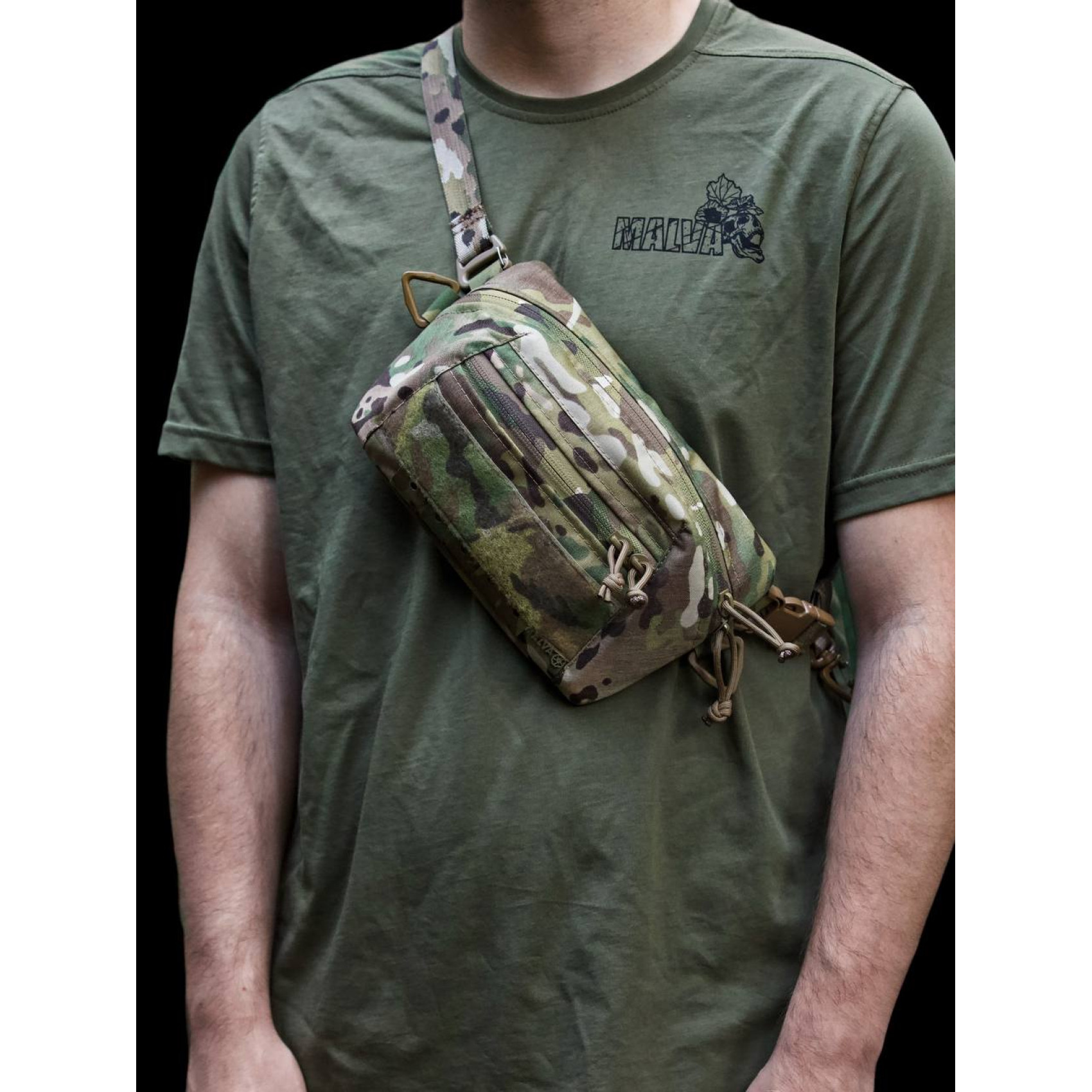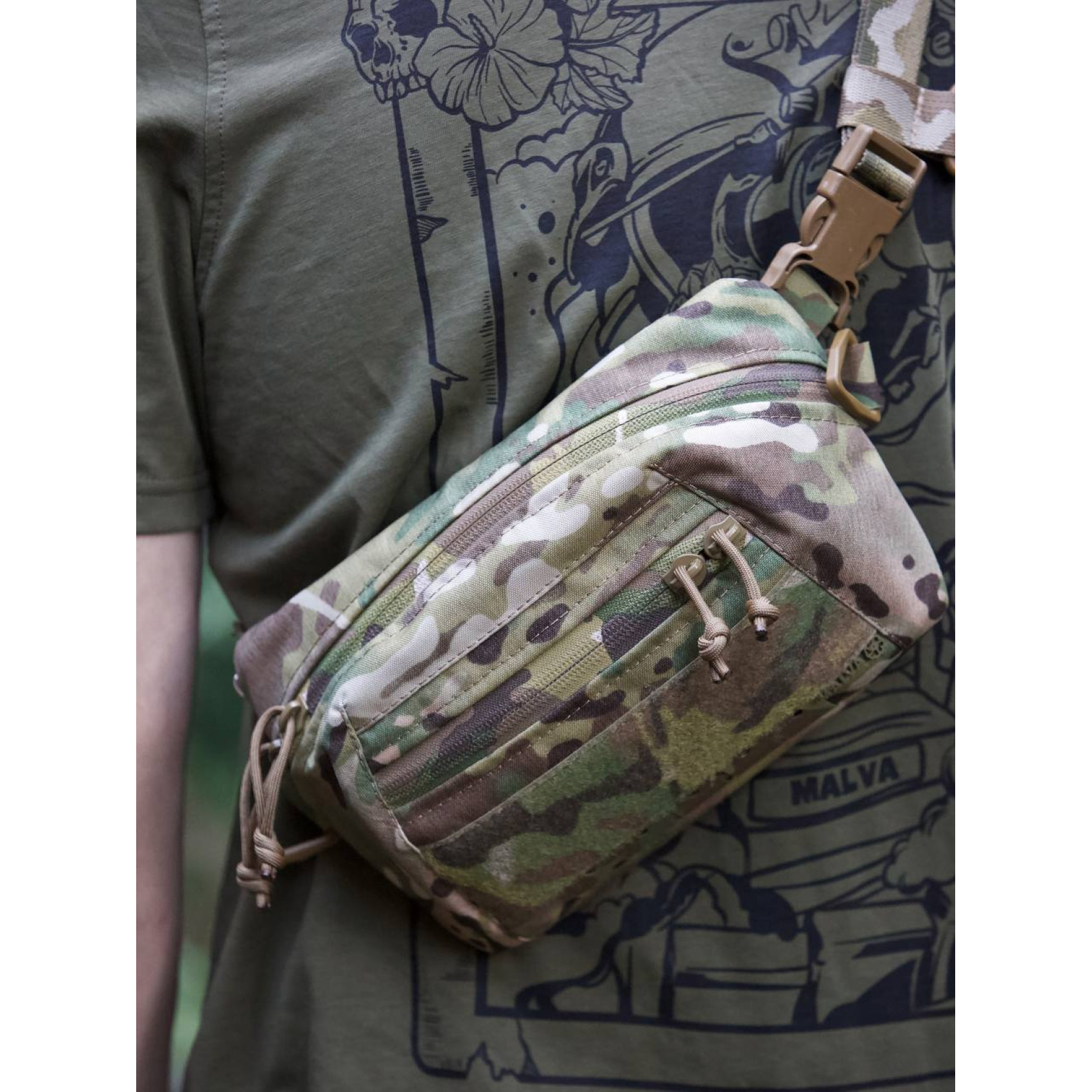 Ремень сумки «Бананка / напашник Malva Мультикам» легко регулируется по размеру, быстро крепится и отсоединяется, а также оснащен дополнительным карабином и кольцом.