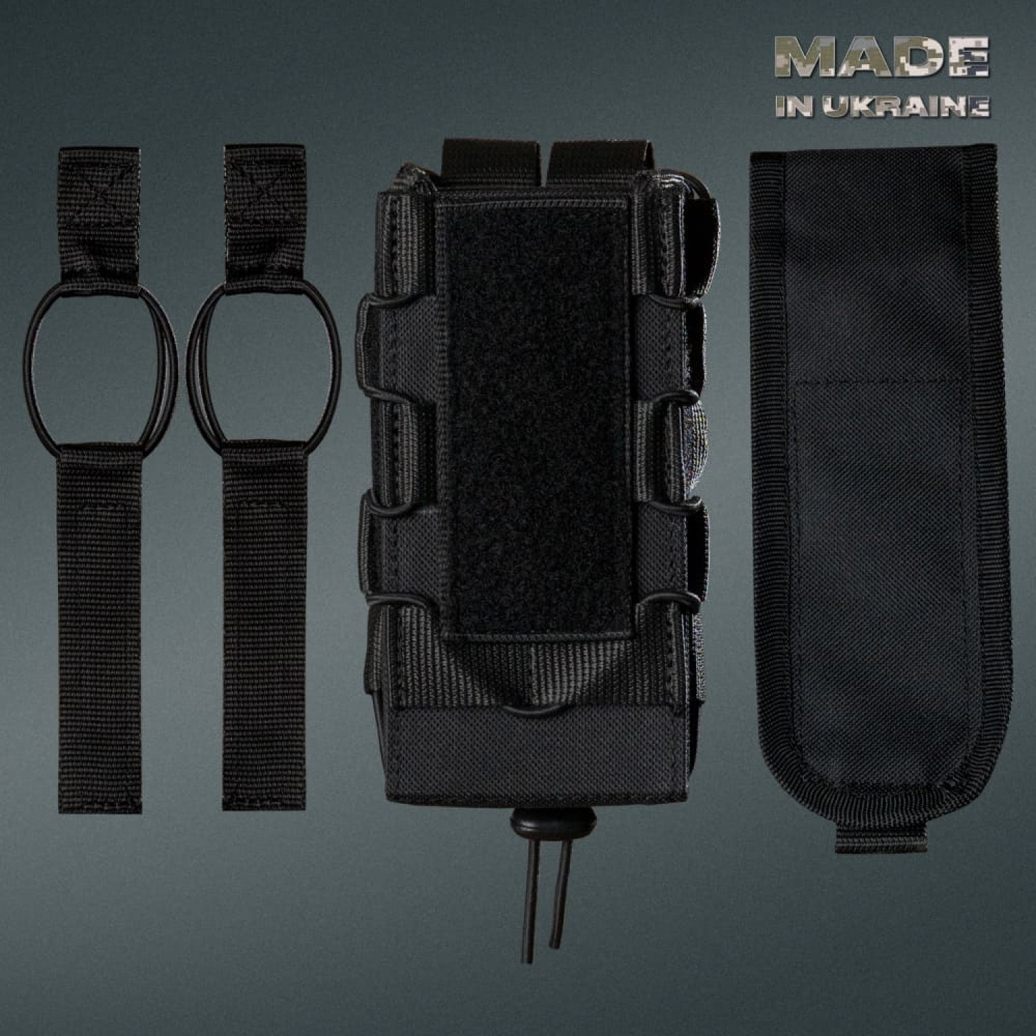 Подсумок двойной для магазинов РПК / AK DEFua Трансформер Черный используется для двух магазинов РПК и РПК-74 (РПК-74М) и АК, калибров 5,45 или 7,62 мм. Размеры подсумка позволяют зафиксировать магазины, и удобно извлечь их для перезарядки, без необходимости дополнительных перехватов. Конструкция позволяет надежно зафиксировать 2 магазина, исключая случайное их выпадение при перемещении лежа, и тому подобное. Также возможно использование в открытом состоянии для увеличения скорости перезарядки.