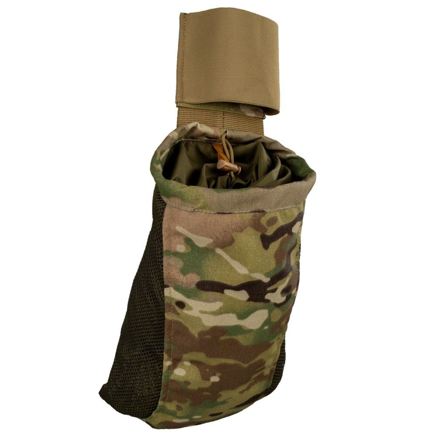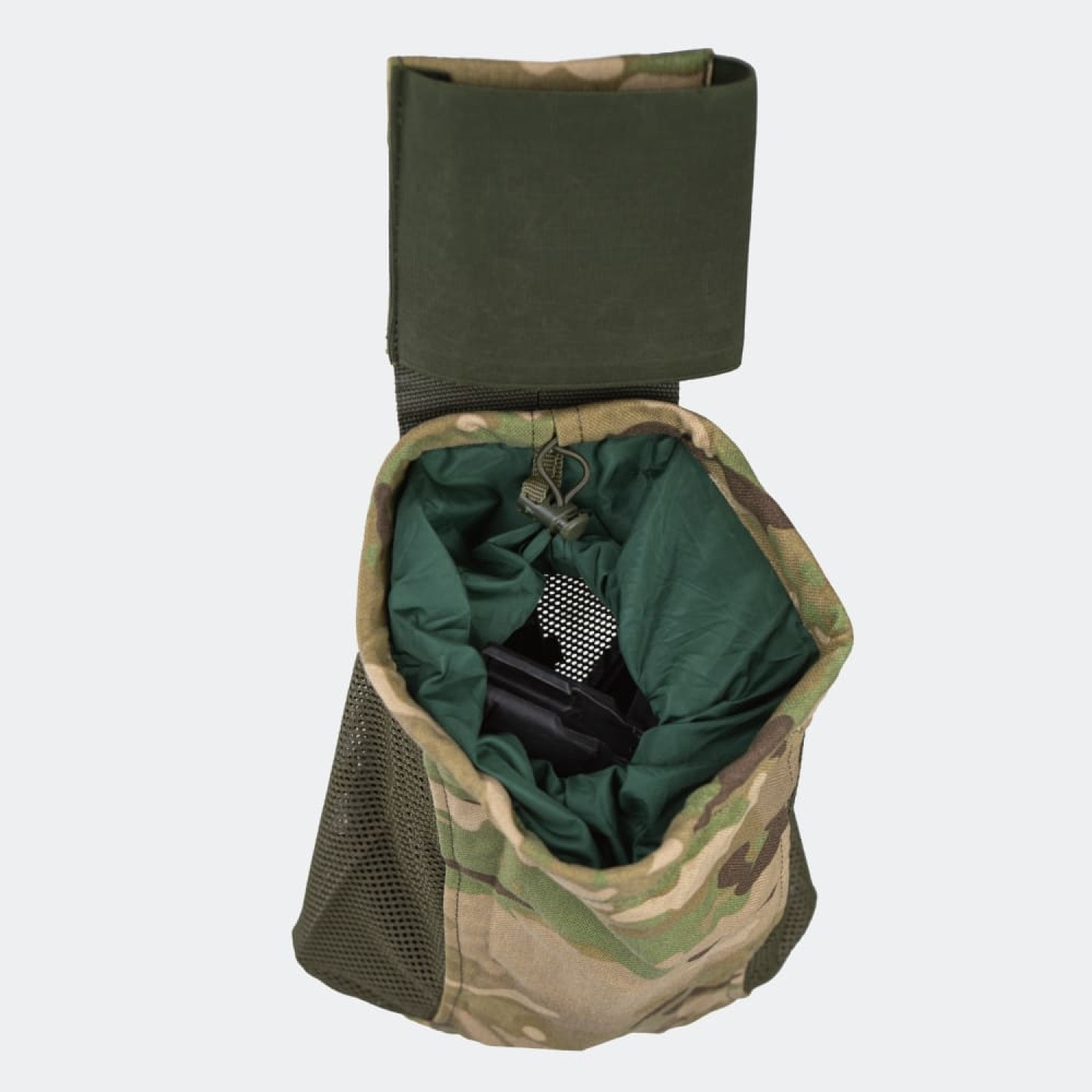 Сумка сброса на платформе DEFua Mark 2 Мультикам выполнена из ткани Cordura 1000D и жесткой нейлоновой сетки Hard 170. Платформа, к которой крепится мешочек-сумка имеет жесткий армирующий каркас и резинку, которая фиксирует мешочек в сложенном положении. Для удобства использования, дно сумки оснащено выдвижной ручкой.