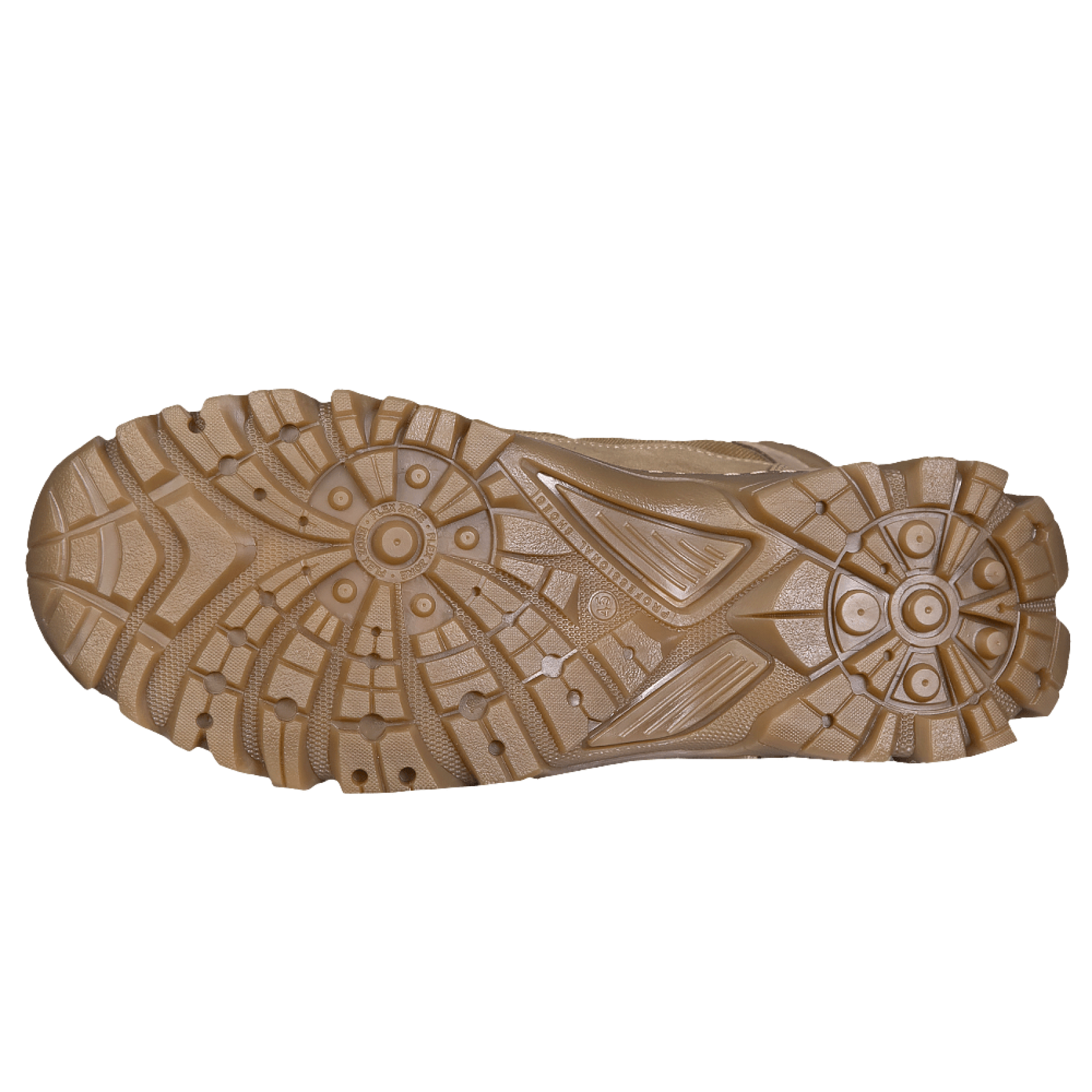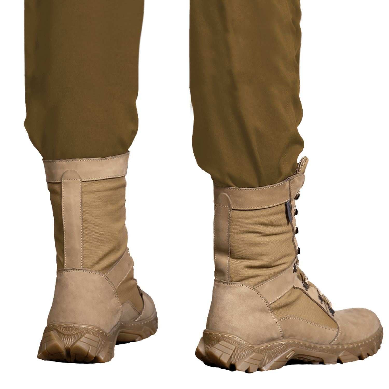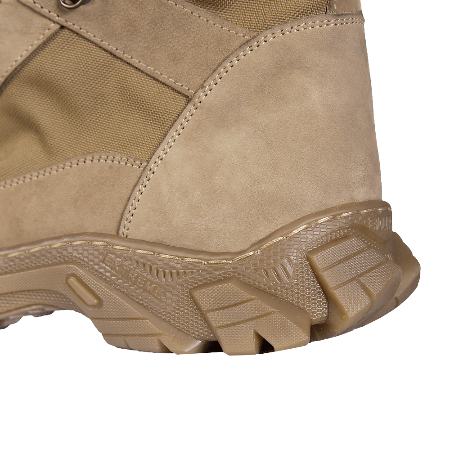 Основа обуви выполнена из натурального нубука - материала, который является прочным, плотным и износостойким, одновременно имеет мягкие и приятные тактильные характеристики. Вставки из кордуры обеспечивают дополнительную прочность и износостойкость. Внутренняя подкладка сделана из сетчатого материала, который обеспечивает хорошую вентиляцию и впитывает влагу, поддерживая комфортный микроклимат внутри обуви. Подошва изготовлена из полиуретана с глубоким, агрессивным протектором, обеспечивающим отличное сцепление с поверхностью. Эта подошва крепится к верхней части берцев с помощью вакуумно-клеевого метода и прошивается усиленной нитью, обеспечивая надежную конструкцию.