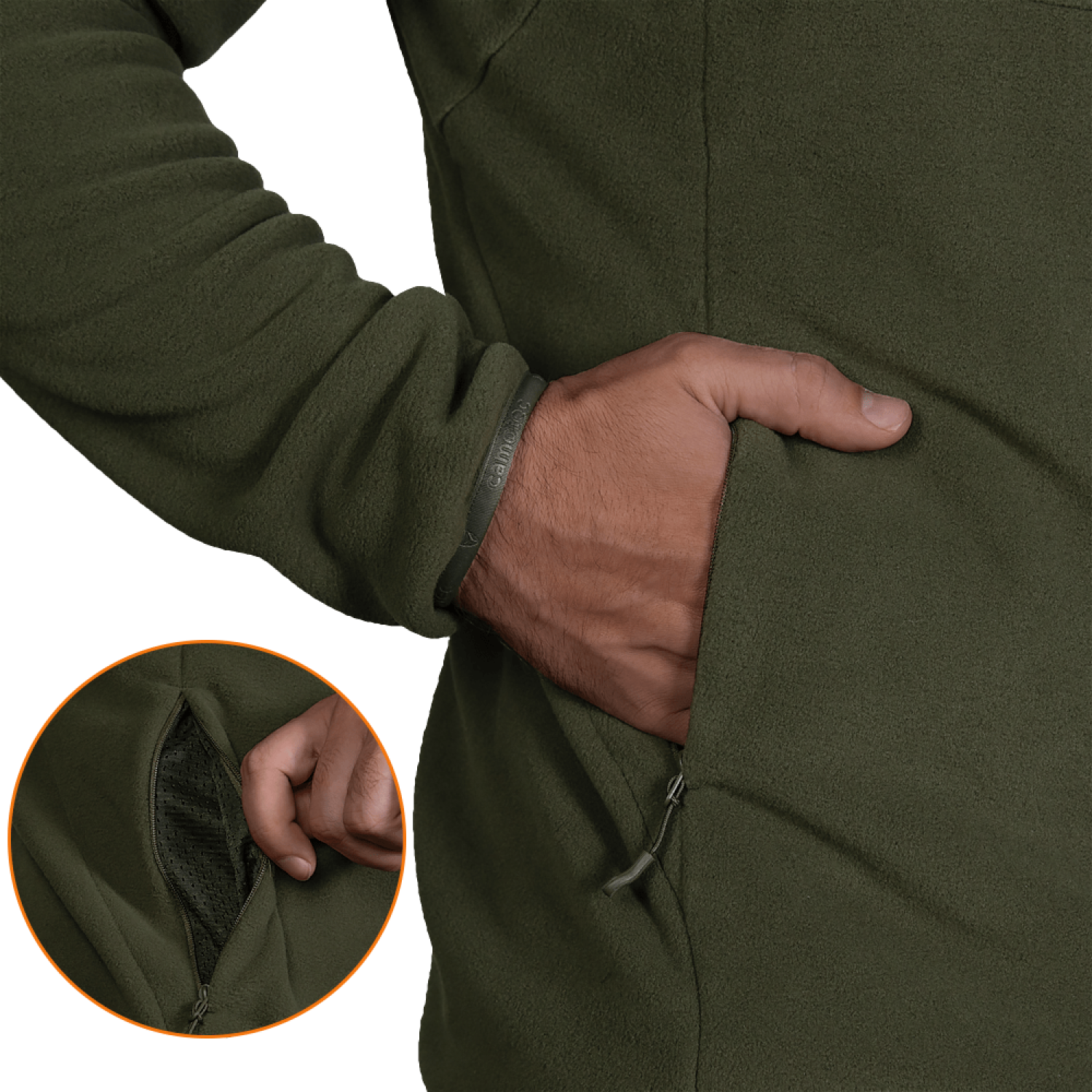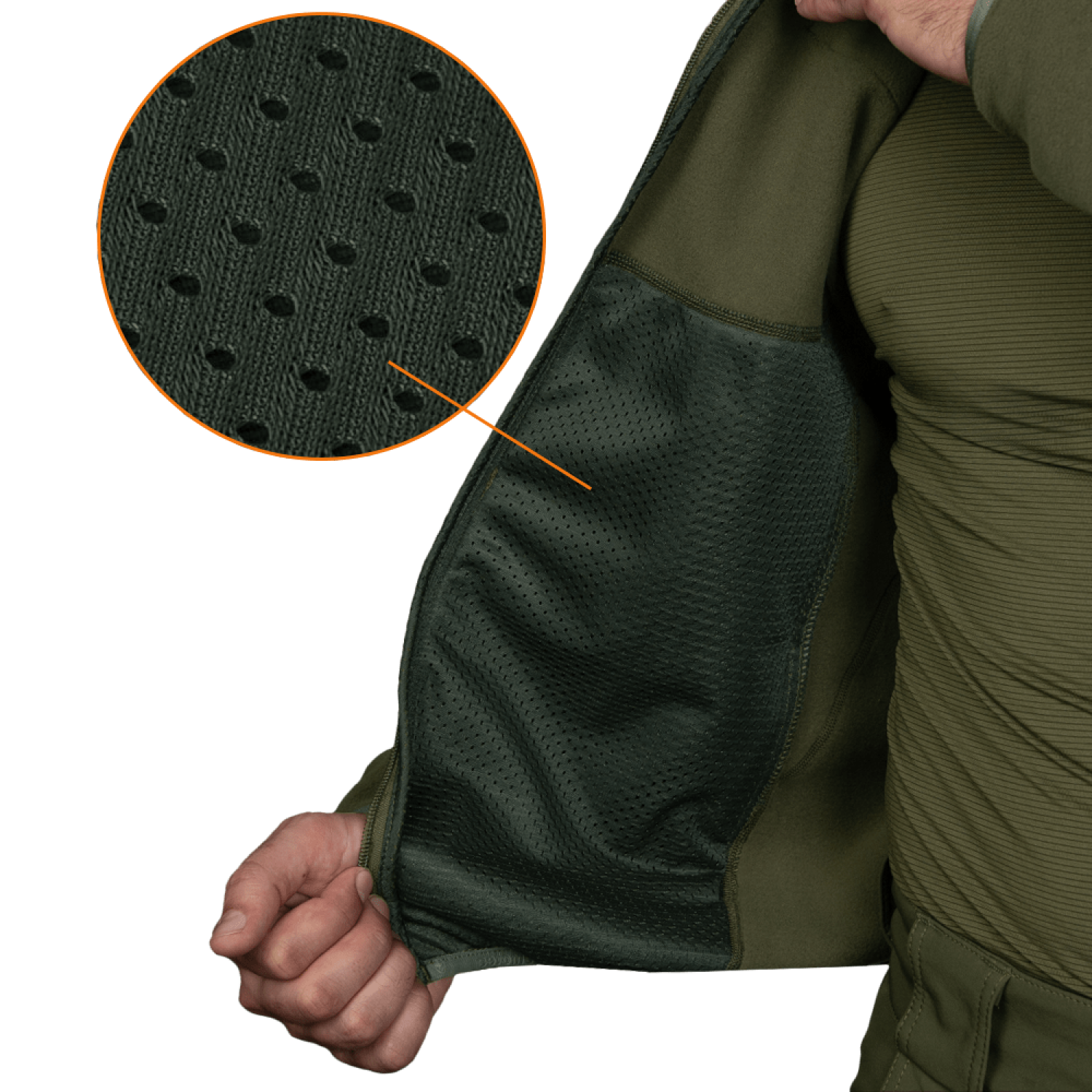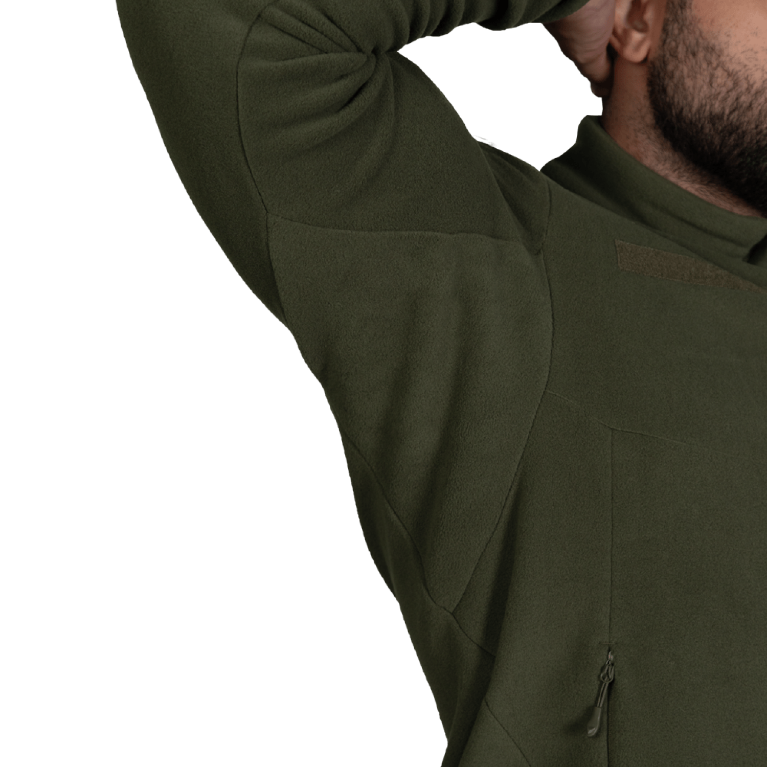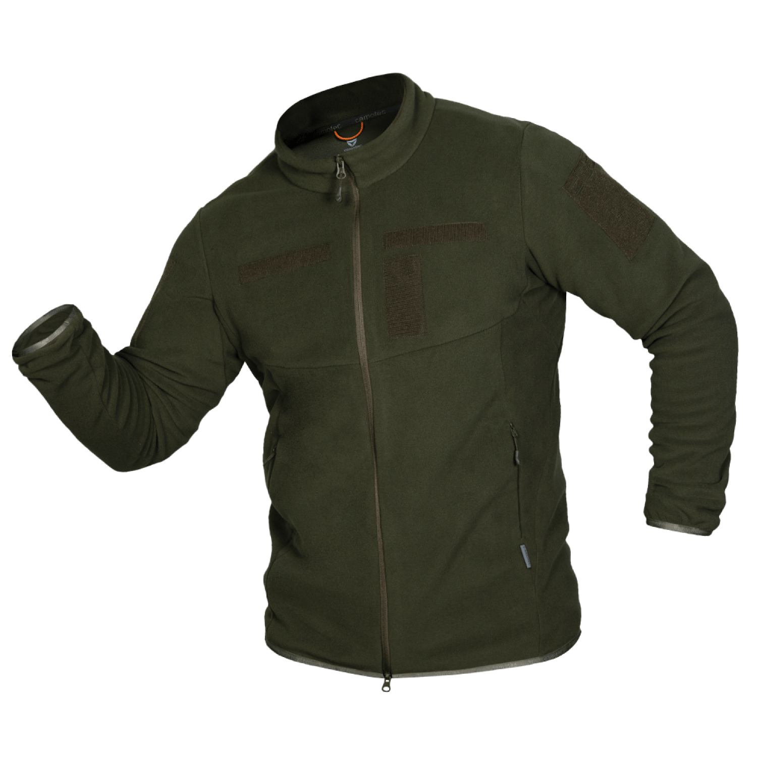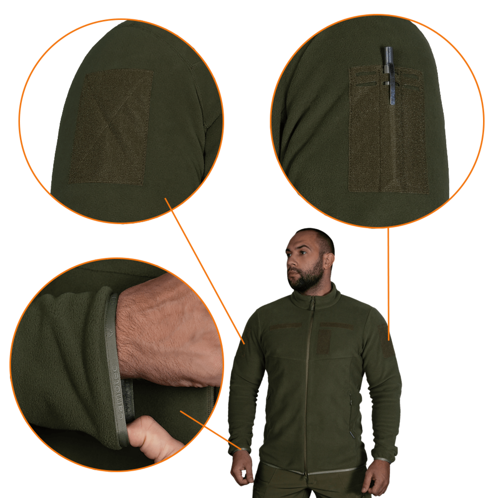 Эргономичный крой кофты обеспечивает свободу движений и комфорт даже при длительном ношении. На рукавах и груди есть липучки для патчей или шевронов, а также крепления для погонов. Кофта также оснащена двумя врезными карманами спереди, оборудованными нейлоновыми застежками-молниями.