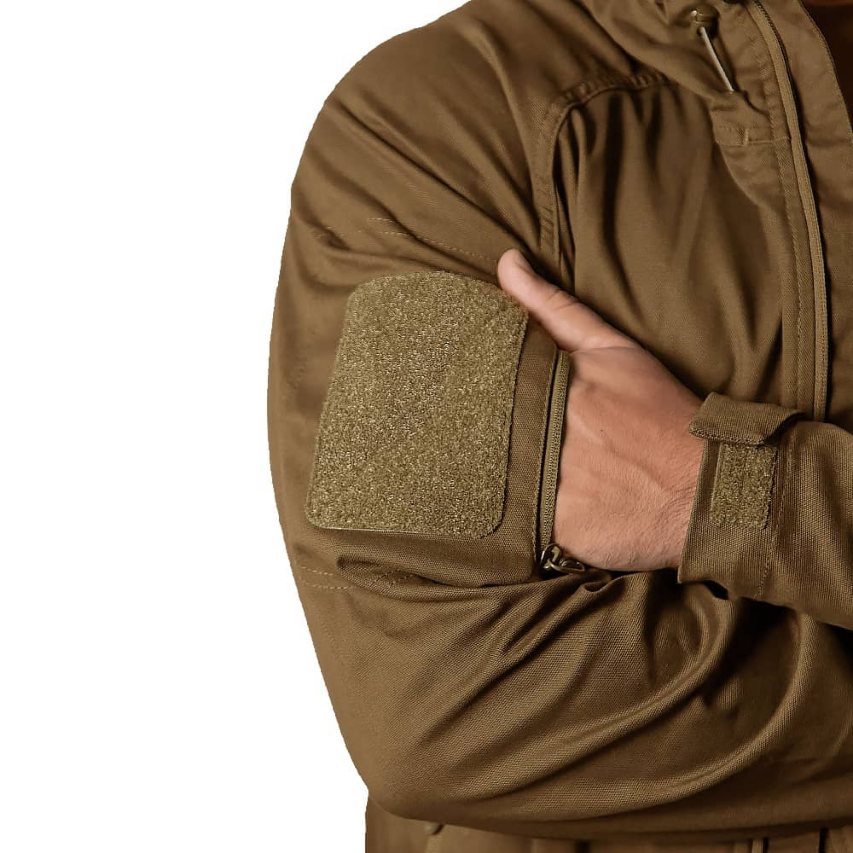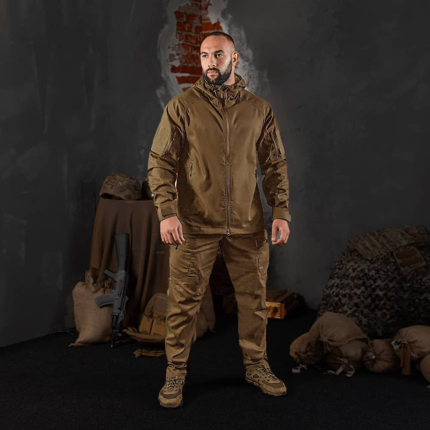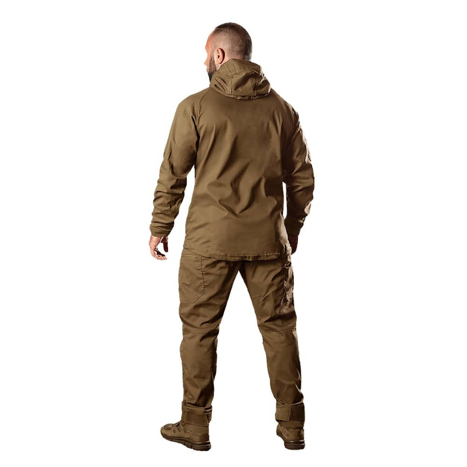 Куртка с капюшоном оснащена четырьмя карманами: два спереди и два под липучками для шевронов. Застежки имеют пуллеры для удобного взаимодействия в перчатках. Воротник завышенный, оснащен защитой от защелкивания подбородка. На поясе присутствуют регуляторы фиксации. Объем рукавов можно менять специальными липучками на манжетах.