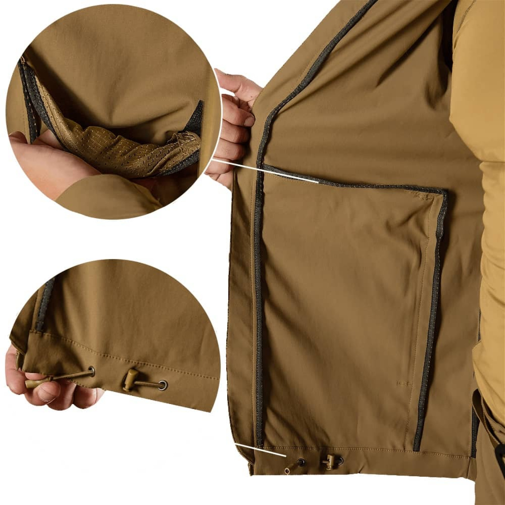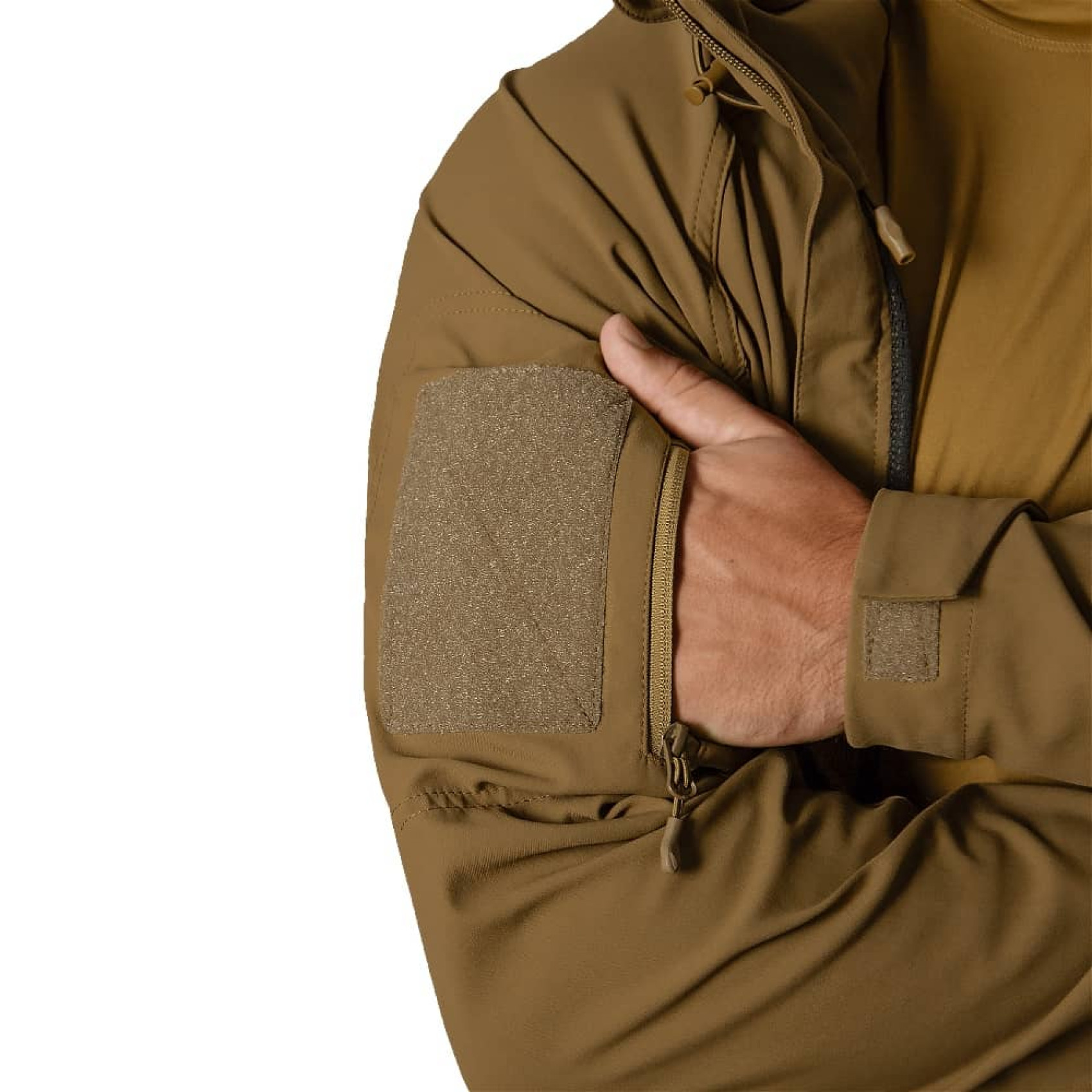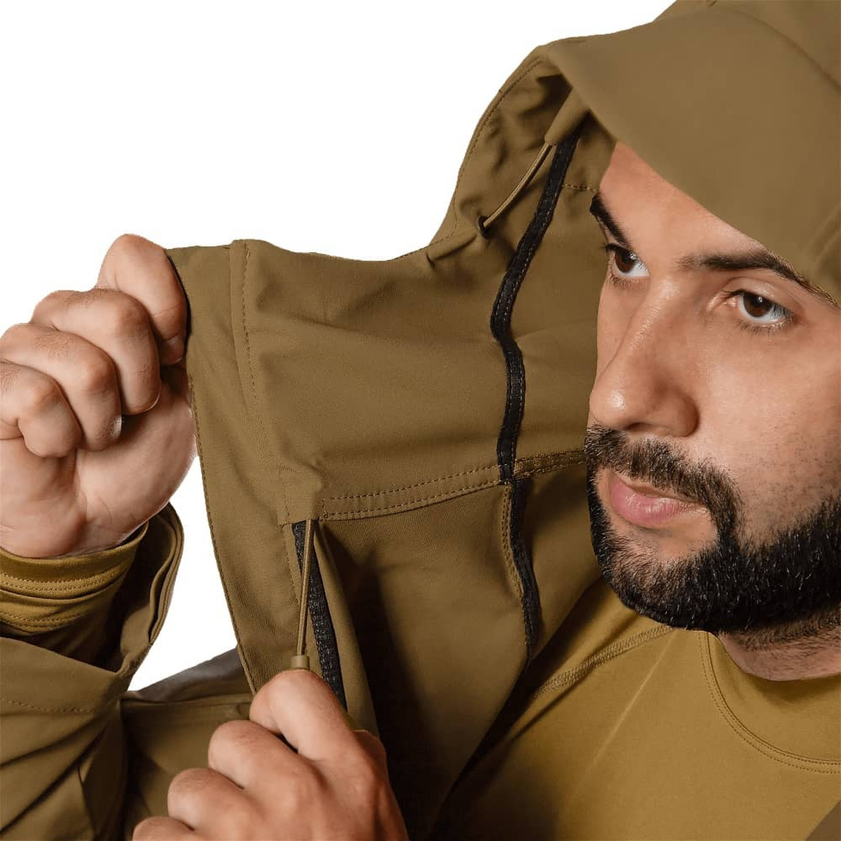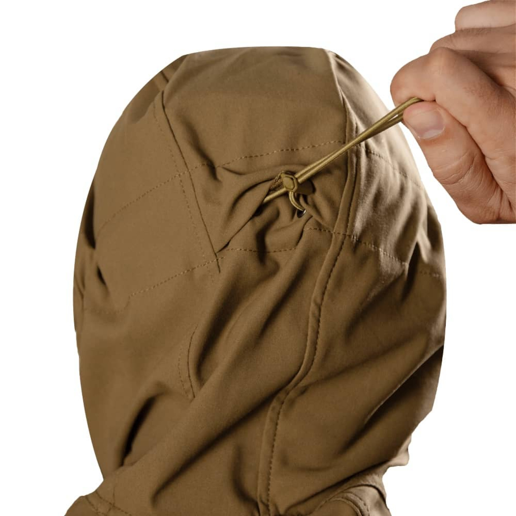Куртка с капюшоном имеет два вместительных кармана спереди и два кармана на рукавах, под липучками для патчей или шевронов. Все застежки-молнии имеют пуллеры для работы с ними в перчатках. Воротник завышен и имеет защиту от защелкивания подбородка. По низу куртки есть специальные утяжки с пластиковыми фиксаторами для регулировки фиксации. Объем рукавов регулируется и фиксируется липучками.