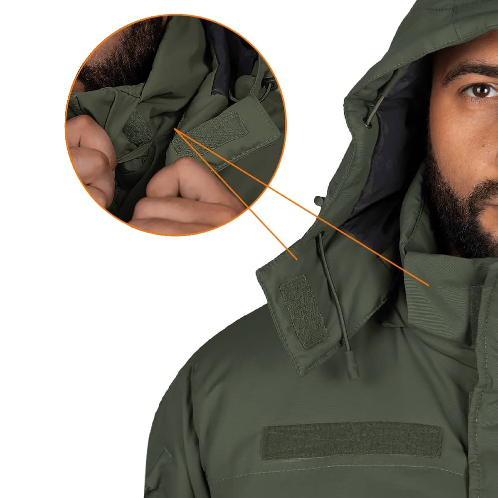 Куртка Camotec Patrol System 3.0 Олива оснащена утепленным капюшоном, который снимается. Он фиксируется на молнию и застегивается на липучки, которые можно спрятать в специальных отделениях в воротнике. Удобный эргономичный дизайн позволяет регулировать глубину, объем и ширину капюшона, а козырек предоставляет дополнительную защиту во время снега и дождя.