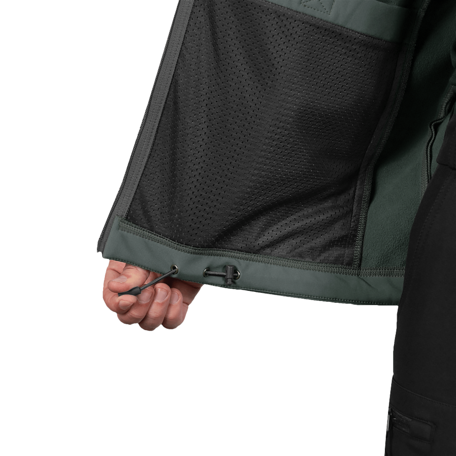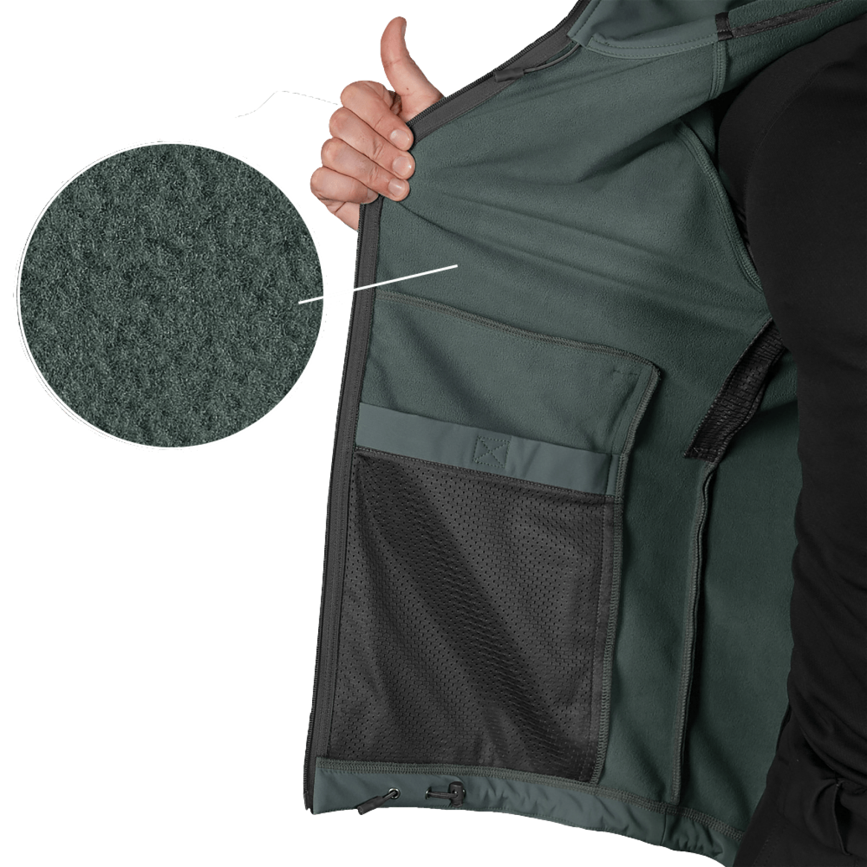 Куртка изготовлена из оригинальной ткани SoftShell, которая является легкой и современной. Ее беспоровая мембрана состоит из трех слоев: микрофлиса, сохраняющего тепло; мембраны, защищающей от ветра и влаги; эластичного полиэстера с влагостойкой пропиткой, который обеспечивает защиту от пыли, грязи и влаги.
