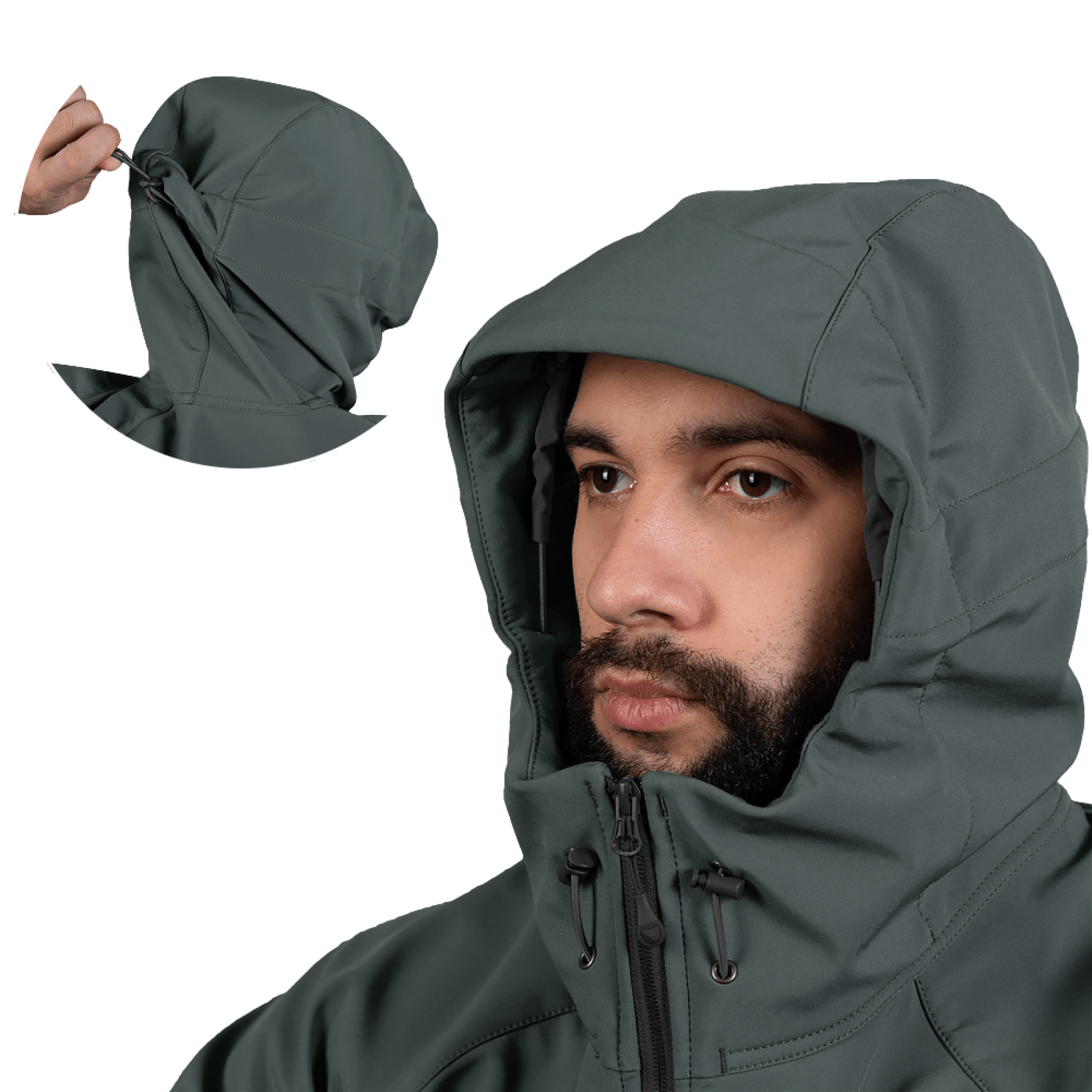 Куртка оснащена эргономичным капюшоном, который не ограничивает обзор и имеет защитный козырек. Регулируется он утяжками с пластиковыми фиксаторами.