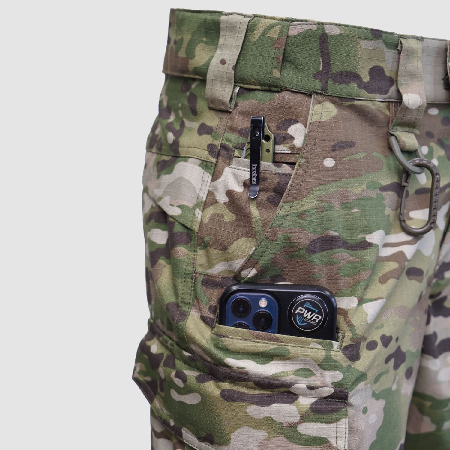 - 2 больших карго кармана, 2 передних с отделениями для ножа/фонарика, карман для телефона, 2 задних кармана
