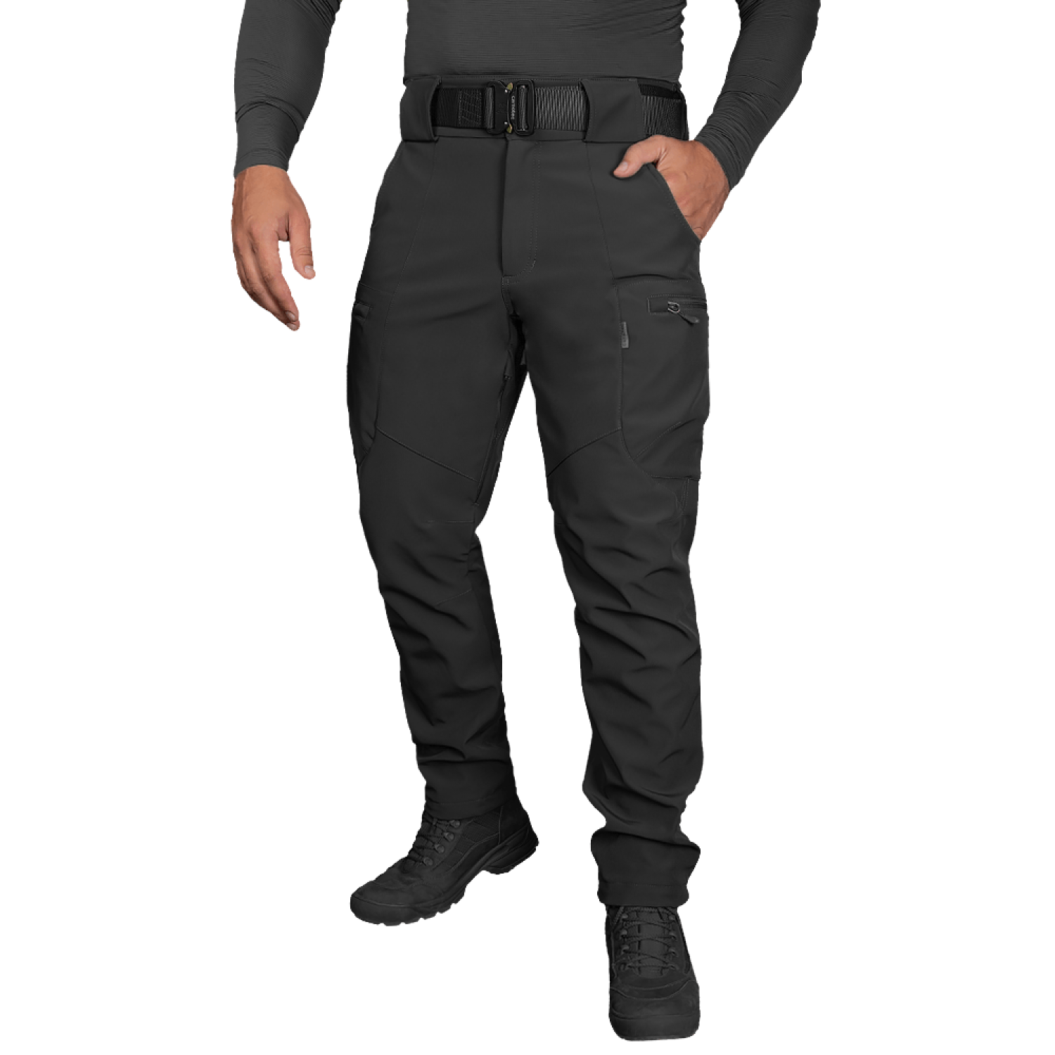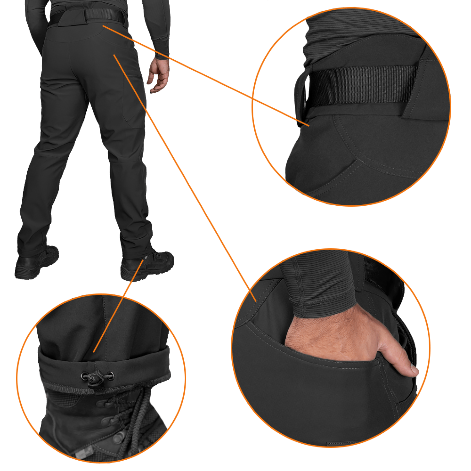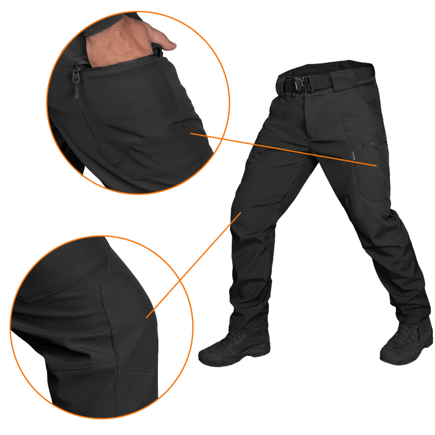 Штаны Camotec SoftShell Vent Черный изготовлены из оригинальной ткани SoftShell. Это современный материал, имеющий настоящую беспоровую мембрану, которая содержит три слоя: микрофлис, сохраняющий тепло; мембрану, защищающую от ветра и влаги; а также эластичный полиэстер с влагостойкой пропиткой, обеспечивающий защиту от пыли, грязи и влаги.