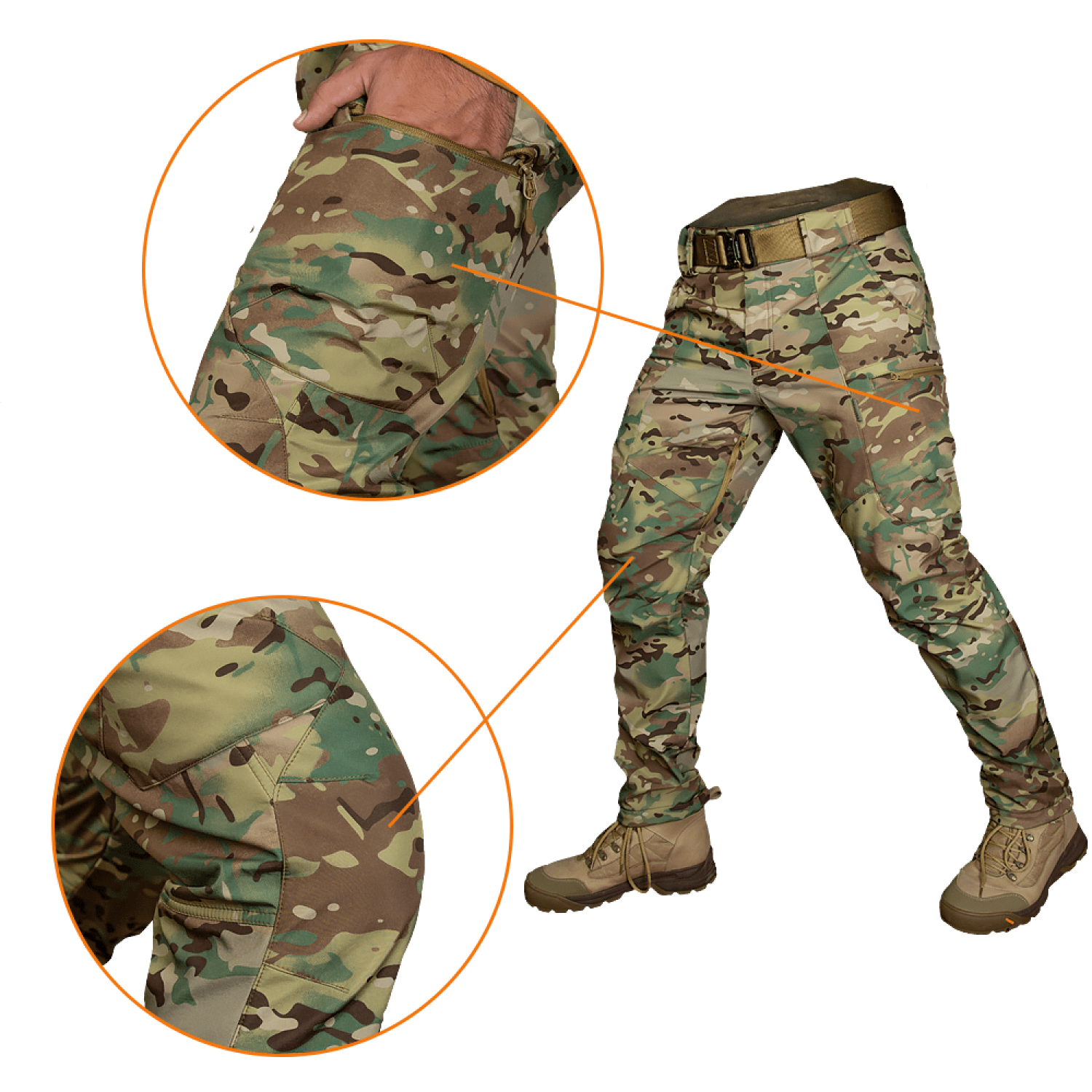 Они также имеют уникальный крой от компании Camotec. Эргономичные выточки в области коленей и специальные вставки в промежности добавляют комфорта и предотвращают натирание при длительном использовании. Одной из ключевых особенностей этих брюк являются вентиляционные отверстия на внутренней стороне бедер, оборудованные сетчатым материалом Cool Mesh для оптимальной вентиляции и охлаждения во время носки. Регулируемые застежки-молнии на этих вырезах позволяют регулировать уровень вентиляции в зависимости от погодных условий и предпочтений пользователя.