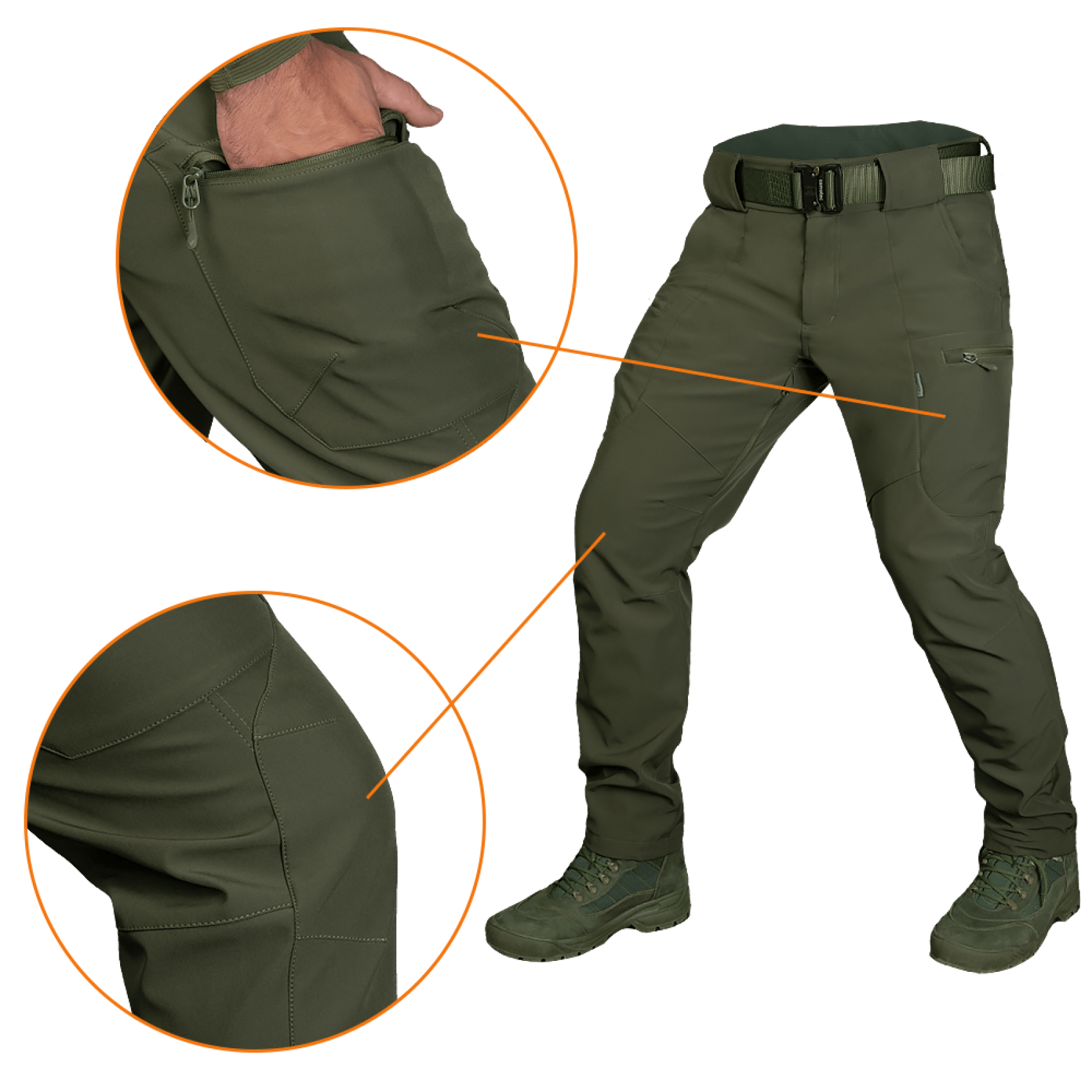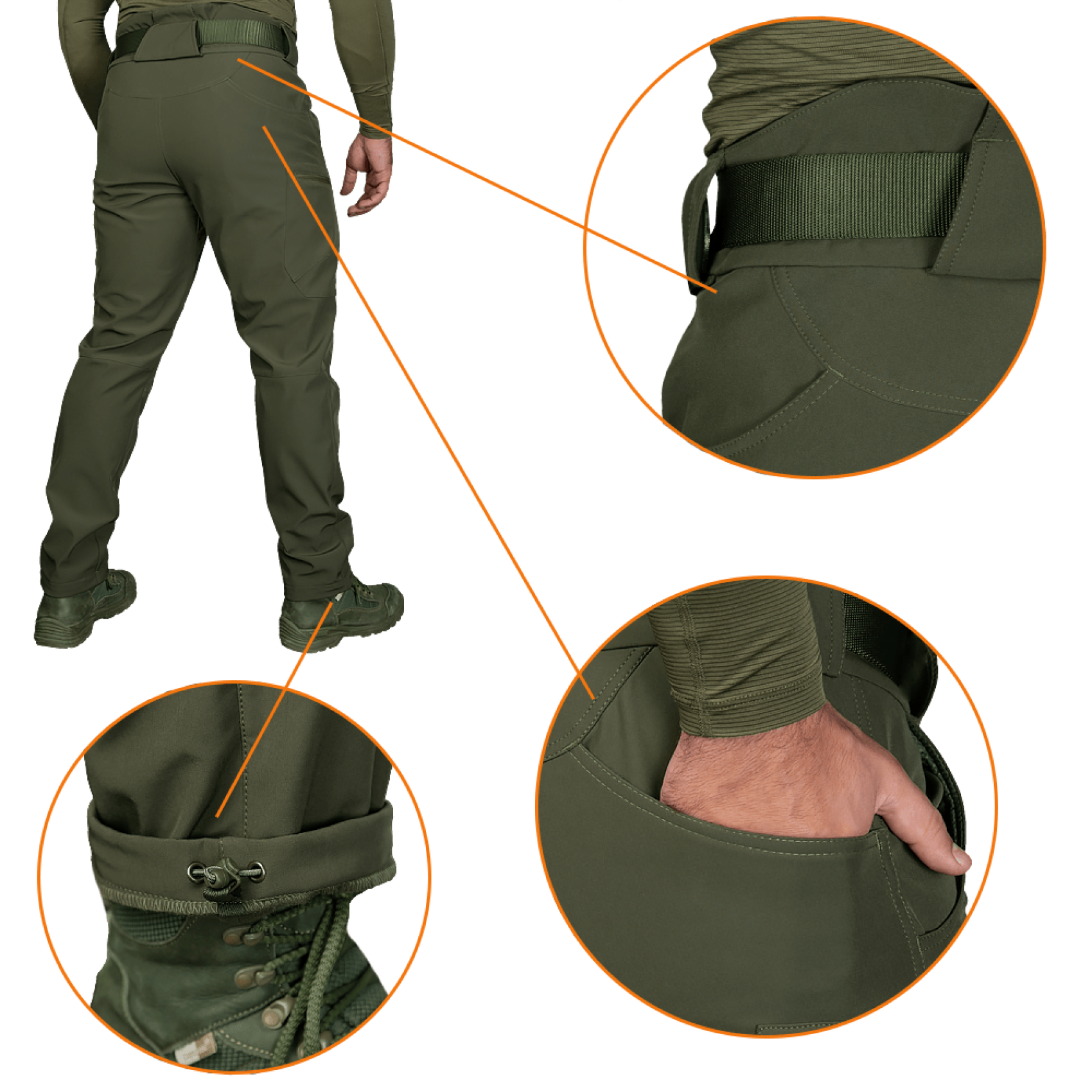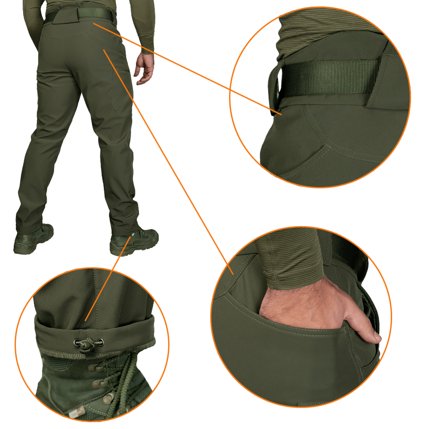 Штаны Camotec SoftShell Vent Олива изготовлены из оригинальной ткани SoftShell. Это современный материал, имеющий настоящую беспоровую мембрану, которая содержит три слоя: микрофлис, сохраняющий тепло; мембрану, защищающую от ветра и влаги; а также эластичный полиэстер с влагостойкой пропиткой, обеспечивающий защиту от пыли, грязи и влаги.