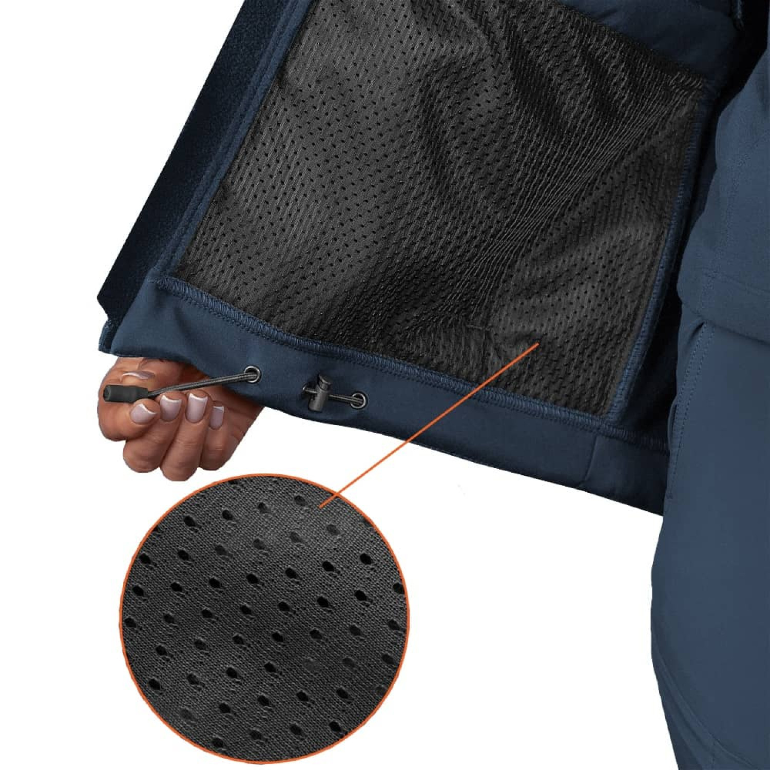Куртка имеет два внутренних кармана и два внешних кармана спереди. Все внешние карманы на застежке-молнии, а также с вентиляционной сеткой Cool Mesh. Дополнительно под мышками присутствуют вентиляционные клапаны с сеткой Cool Mesh, на застежке-молнии. Объем и посадка по низу куртки регулируется утяжками с пластиковыми фиксаторами. Также по низу куртки присутствует резинка с утяжками для регулировки объема и фиксации.