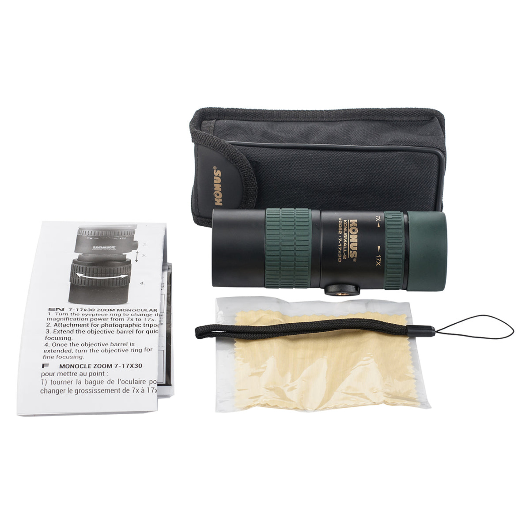 При выбранном увеличении (от 7x до 17x) фокусировка регулируется на два этапа. Грубая фокусировка достигается выдвижением объектива, а точная - вращением кольца объектива. При небольших увеличениях диаметр выходного зрачка монокуляра комфортен для длительного наблюдения, однако при очень больших увеличениях наблюдение необходимо периодически прерывать для отдыха глаз. Сейчас - лучшее время купить монокуляр Konus Konusmall-2 7-17x30!