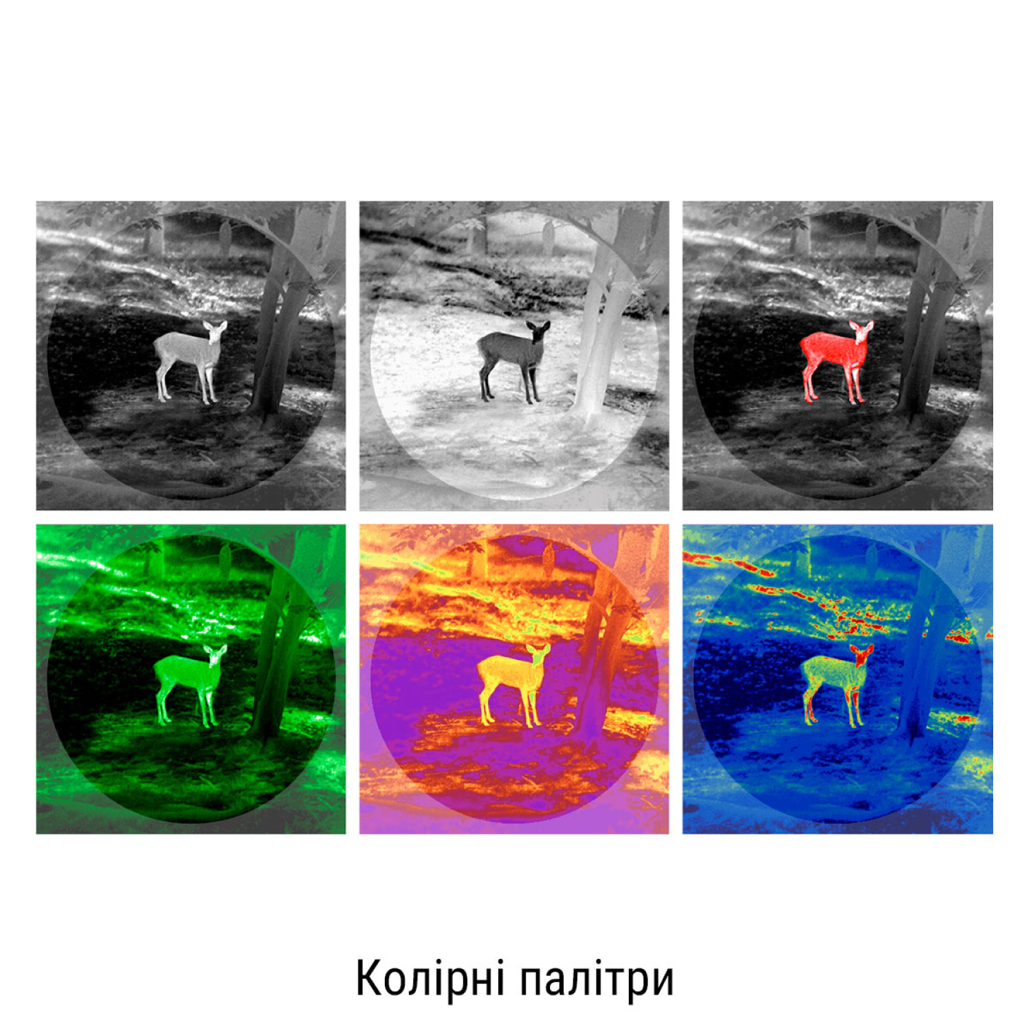 - Палитры цветов: Black Hot, White Hot, Adjustable Red Hot, Iron Red, Blue Hot, Green Hot