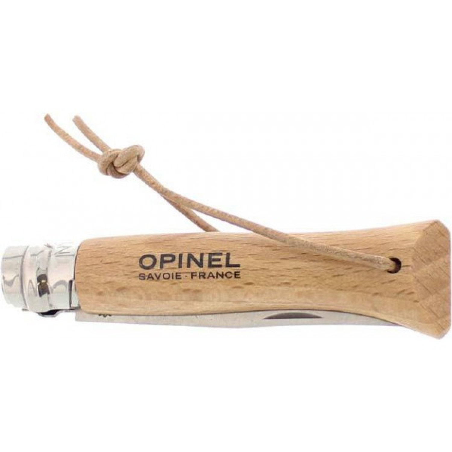 Нож Opinel №7 VRI Trekking имеет округлую форму рукоятки, на ее конце можно увидеть отверстие через которое продет кожаный темляк. С его помощью данный инструмент закрепляется на ремне брюк, ключах или других элементах рыбацкой или походной экипировки.