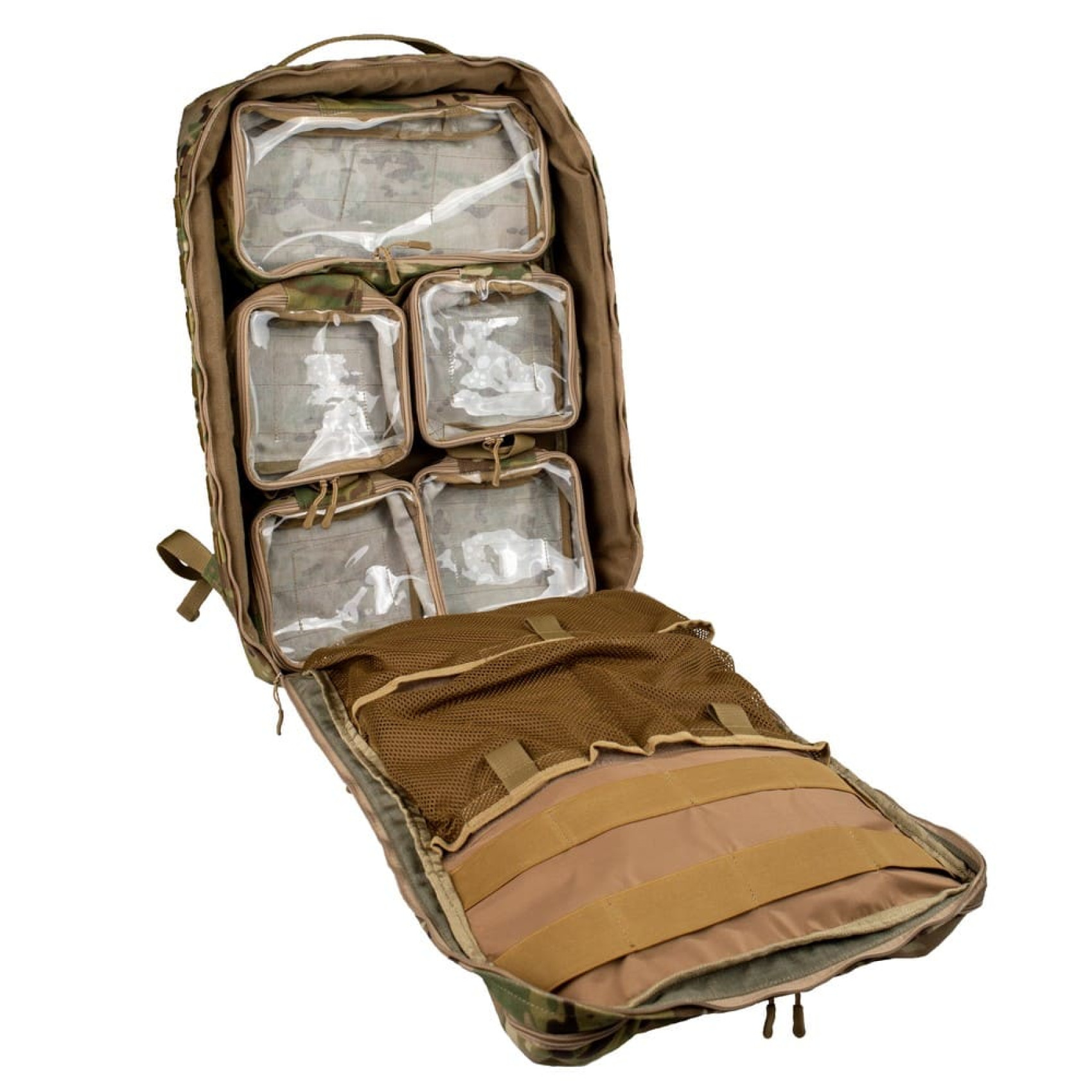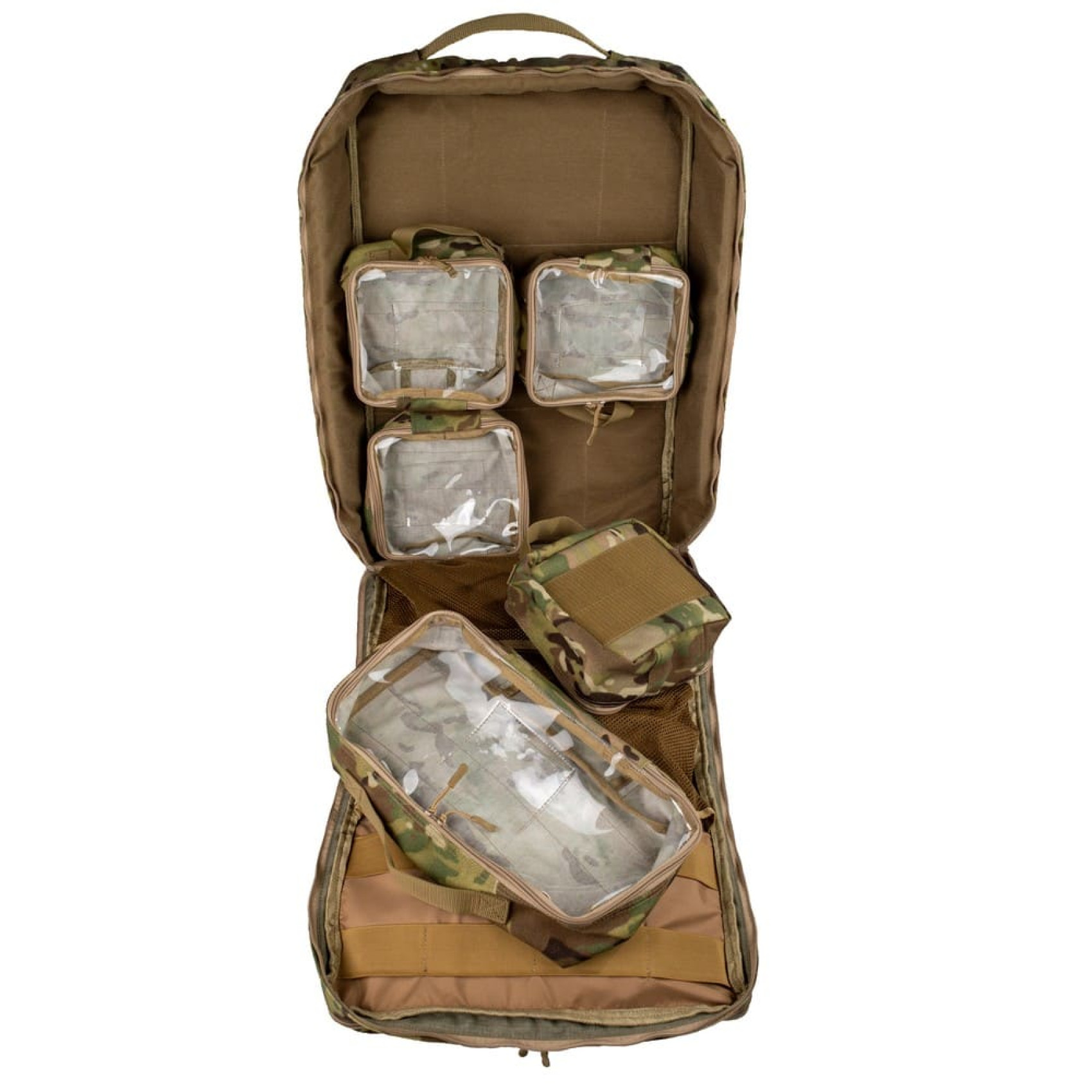 Рюкзак для тактичної медицини DEFua TRMB Мультикам - зручний та надійний наплічник спроєктований відповідно вимог військових лікарів та парамедиків. Має модульну структуру, яка дозволяє зручно організувати внутрішній простір та розділити медикаменти відповідно до їх призначення, або зон медичної допомоги відповідно протоколів M.A.R.C.H. (M (Massive bleeding) – Масивна кровотеча; A (Airway Management) – Управління дихальними шляхами; R (Respiration) – Дихання; C (Circulation) – Циркуляція; H (Head injury / Hypothermia / Hypovolemia) – Травма голови / Гіпотермія / Гіповолемія.)