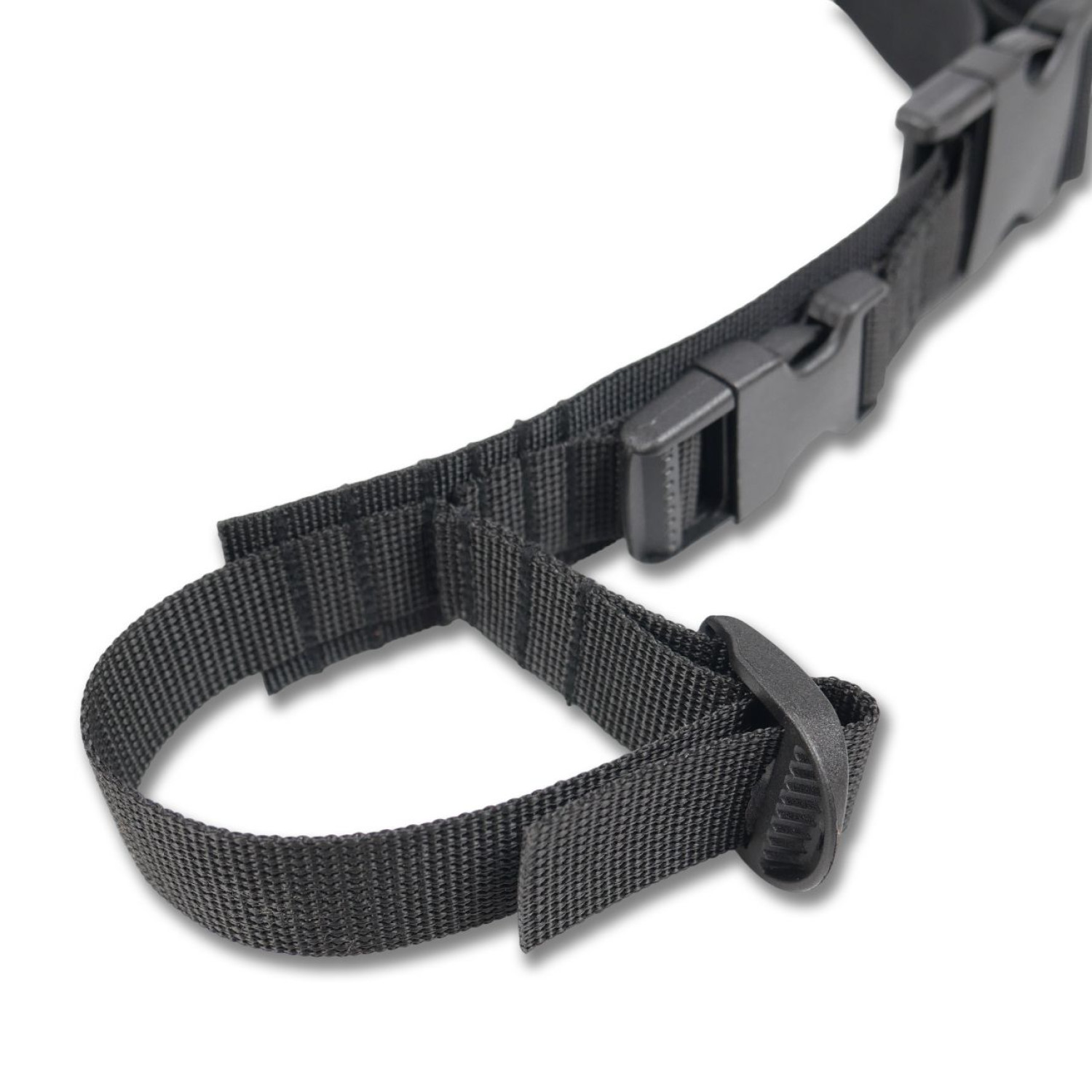 - Кріплення ременя до зброї здійснюється за допомогою перетяжок, що, на відміну від металевих карабінів, унеможливлюють демаскуючий брязкіт і дзвін.