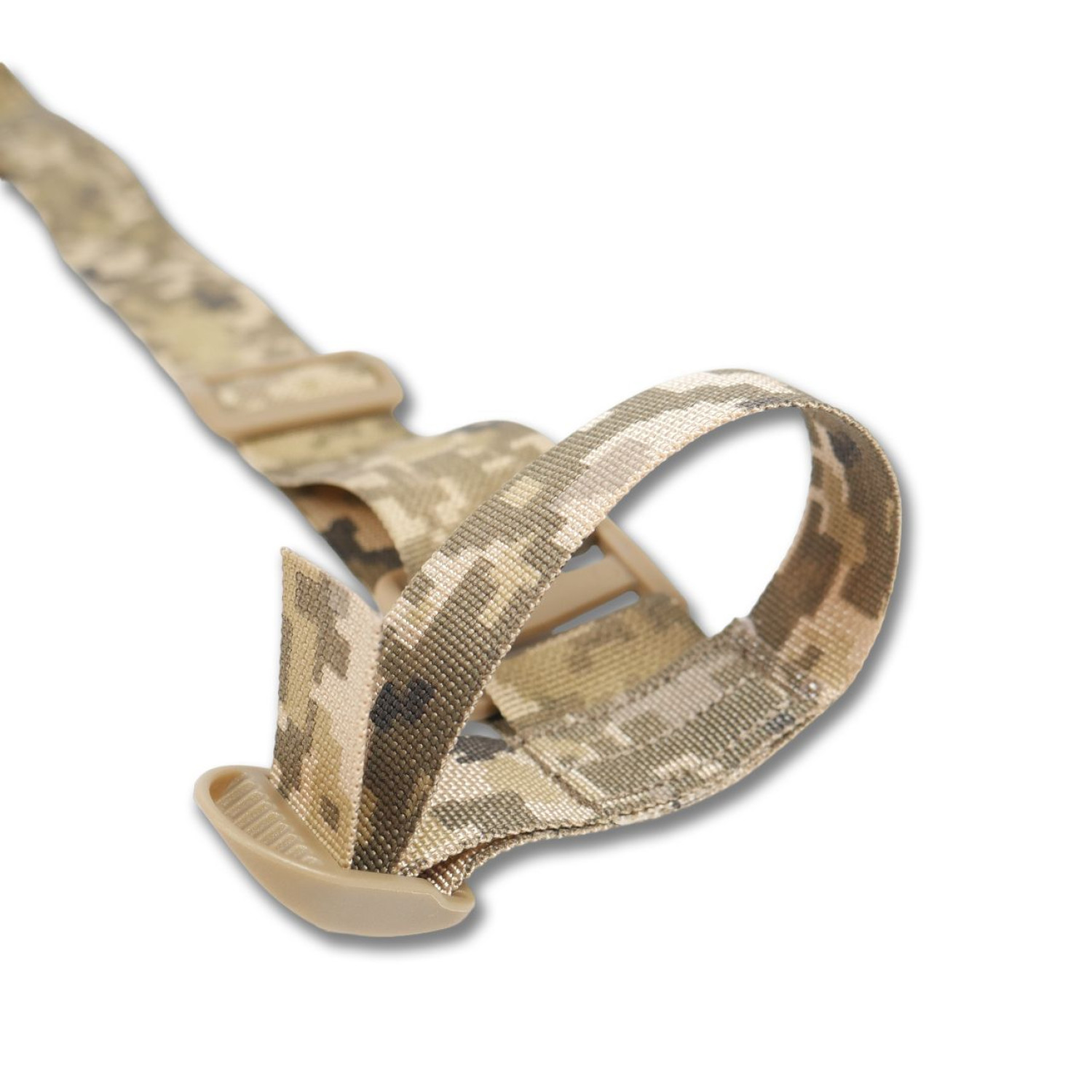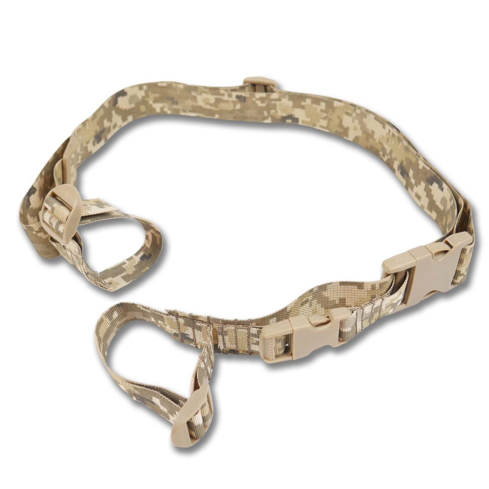 - Кріплення ременя до зброї здійснюється за допомогою перетяжок, що, на відміну від металевих карабінів, унеможливлюють демаскуючий брязкіт і дзвін.