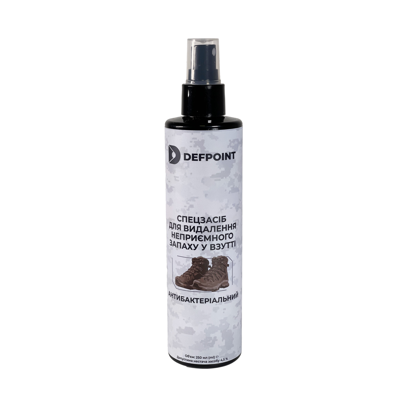 Спеціальний засіб для усунення неприємного запаху у взутті Defpoint (антибактеріальний) розроблений спеціально для використання військовими, співробітниками МНС, спецслужбами та іншими представниками силових структур, а також мисливцями, рибалками та туристами. Його посилена формула нейтралізації запаху відрізняється від звичайних дезодорантів: замість того, щоб маскувати неприємний запах, цей засіб знищує бактерії, які є його джерелом, завдяки наявності дезінфектанту. Спецзасіб Defpoint має антибактеріальний ефект і успішно усуває запах за періодичного використання. Цей продукт містить спирт, який негайно знищує частину бактерій, що створюють запах, і розчинений дезінфектант, який залишається на поверхні та запобігає подальшому розвитку бактерій. Регулярне застосування цього засобу дає змогу позбутися неприємних запахів і запобігти їхньому поверненню.