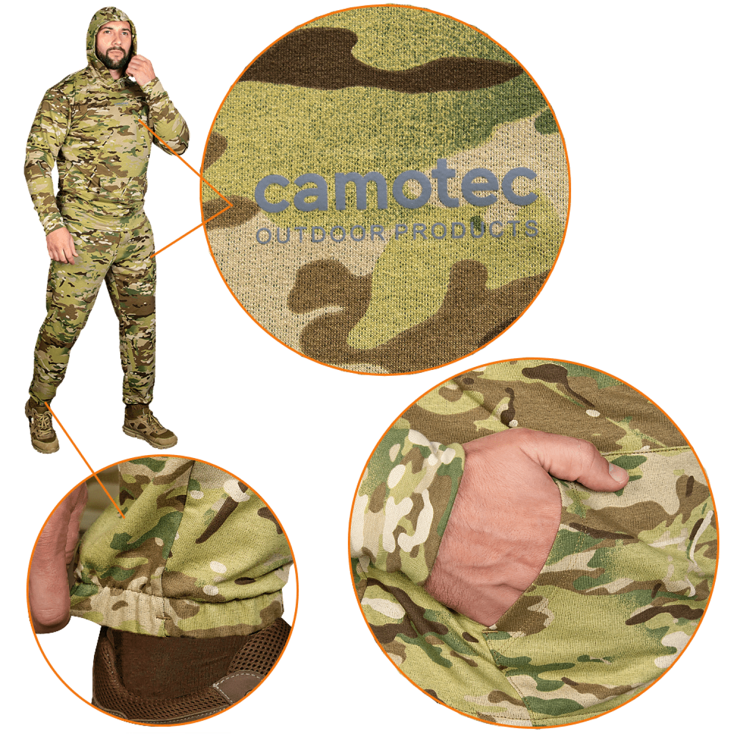 Спортивний костюм Camotec Basic Hood 3.0 Мультикам з каптуром, який підійде для прогулянок, на кожен день або як базовий домашній одяг. Також гарний варіант для військових, які знаходяться в місцях передислокації.